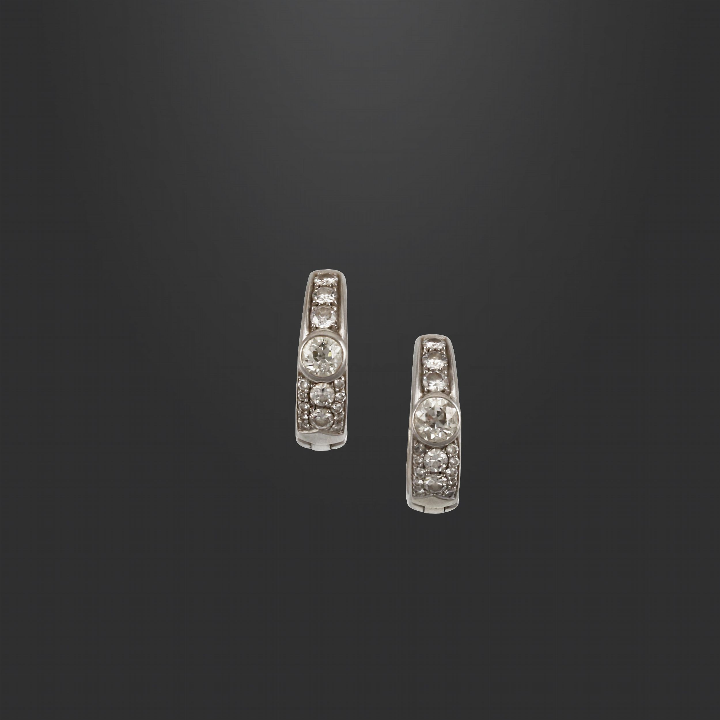 a nastro realizzati in platino e oro bianco con due diamanti taglio antico europeo del peso complessivo di 1 ct ca., restanti brillanti del peso complessivo di 1,50 ct ca., gr. 17,5.lunghezza 2,3 cm ca.