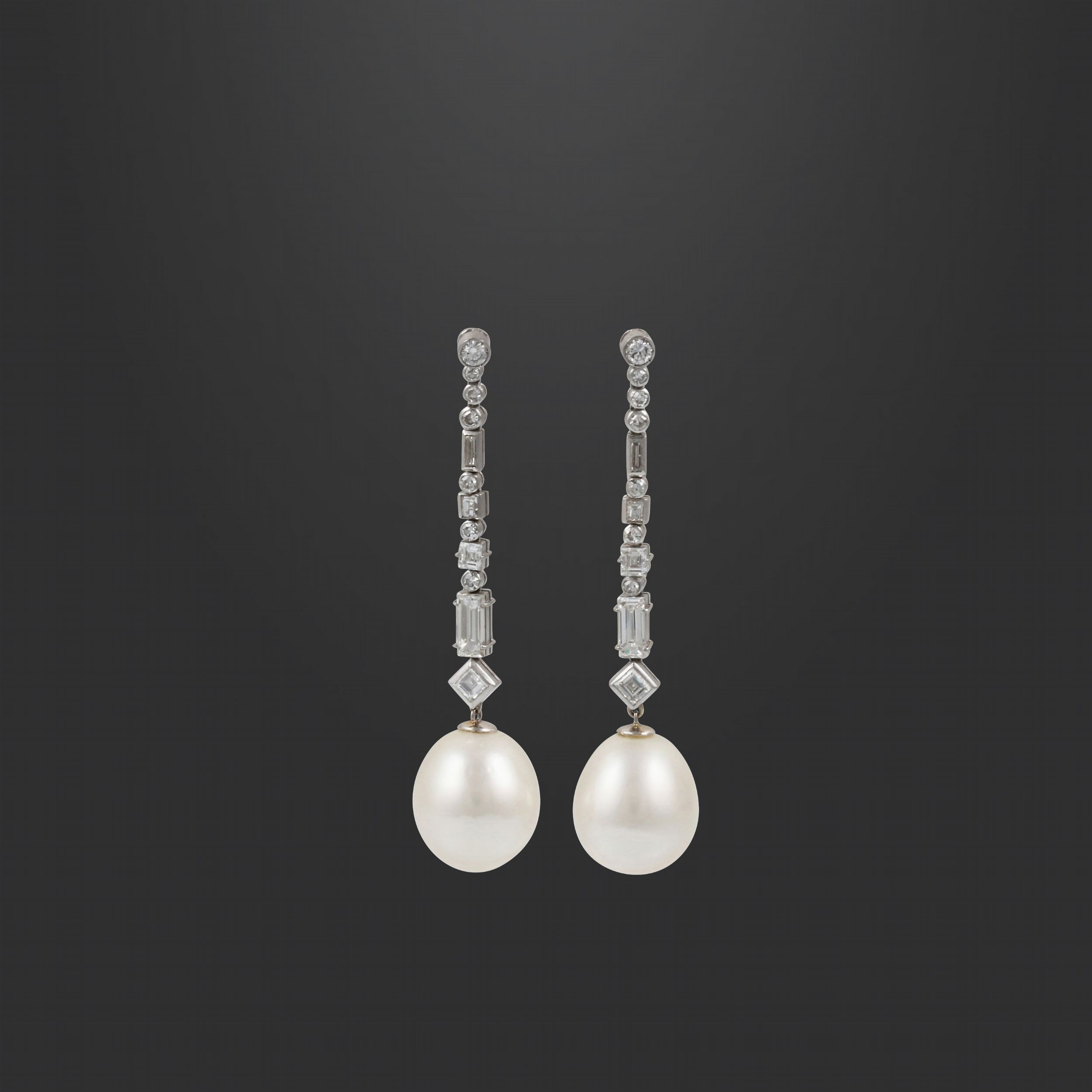 pendenti in oro bianco con perle South Sea ovali sostenute da diamanti taglio a brillante, baguette e carré disposti in linea del peso complessivo di 1,50 ct ca., gr. 13,4.Lunghezza 5,5 cm ca.