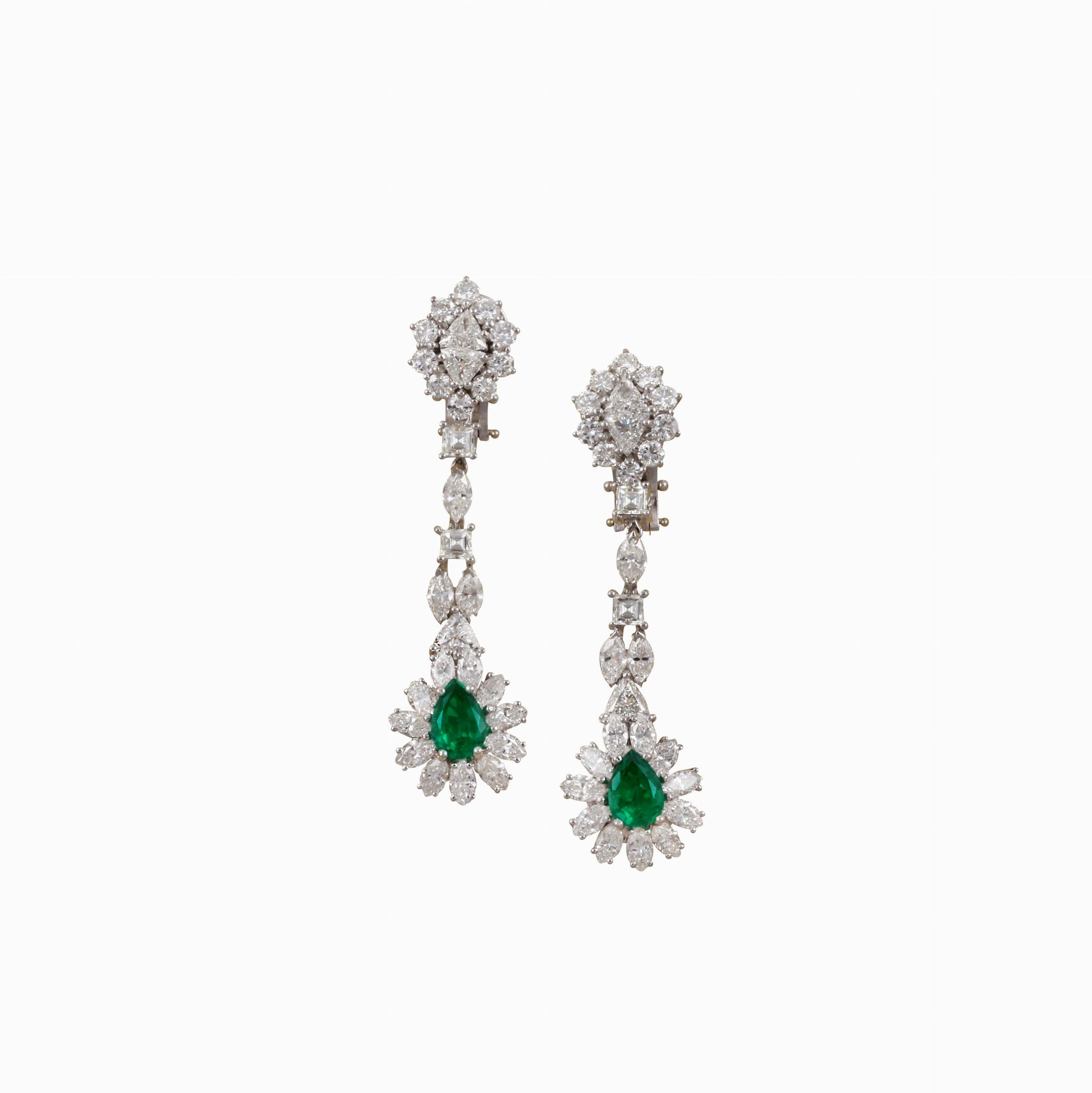 pendenti a clip realizzati in oro bianco, brillanti, diamanti taglio navette, carré e triangolare, ciascuno con smeraldo a goccia contornato da diamanti navettes, gr. 15,8. Smeraldi del peso complessivo di 1,50 ct ca., diamanti del peso complessivo di 5,60 ct ca.