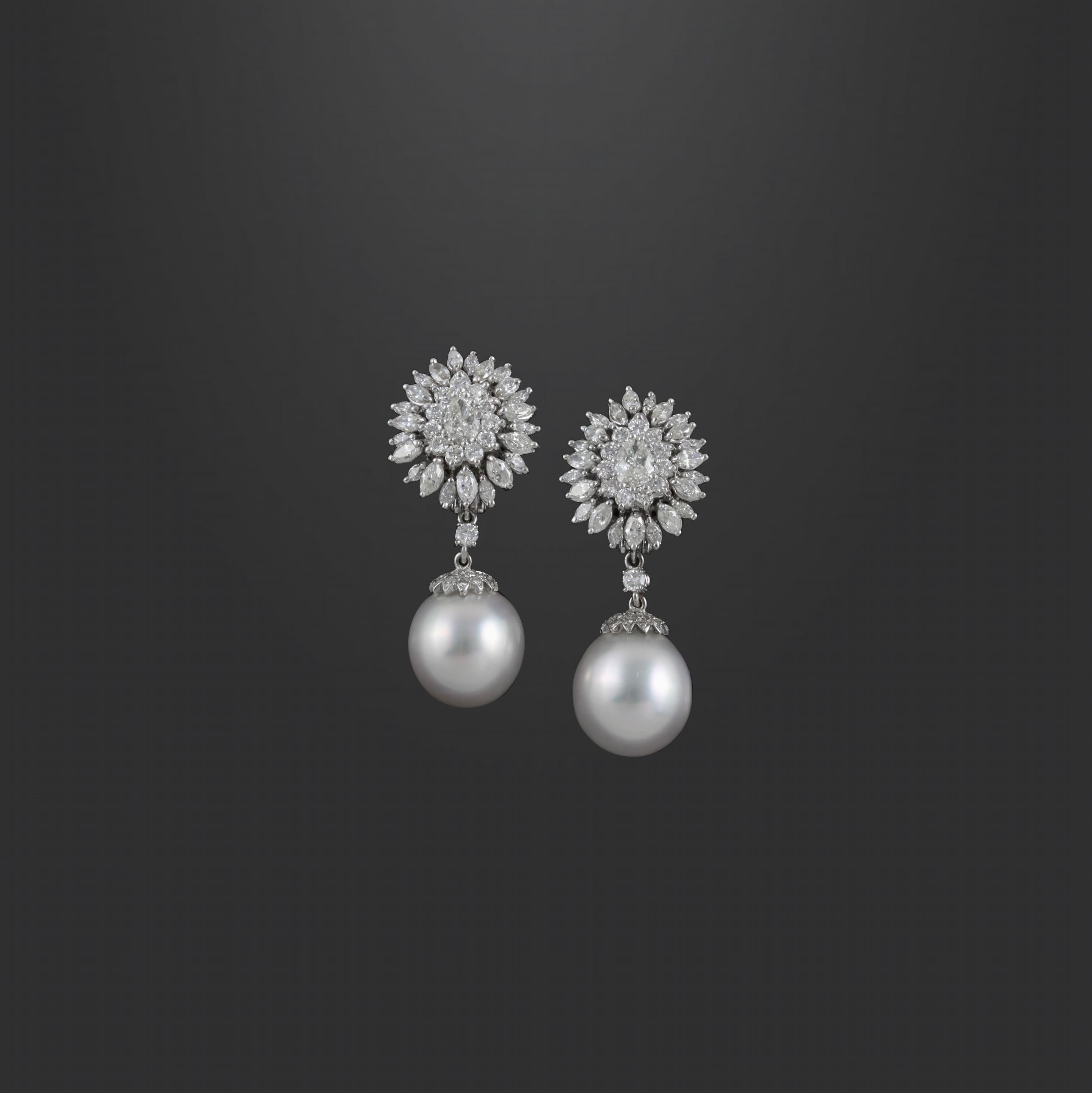 pendenti in platino e oro bianco ciascuno con motivo a rosone in diamanti del peso complessivo di 3,20 ct ca. e perla South Sea sospesa, gr 23,3. Corredati da custodia.