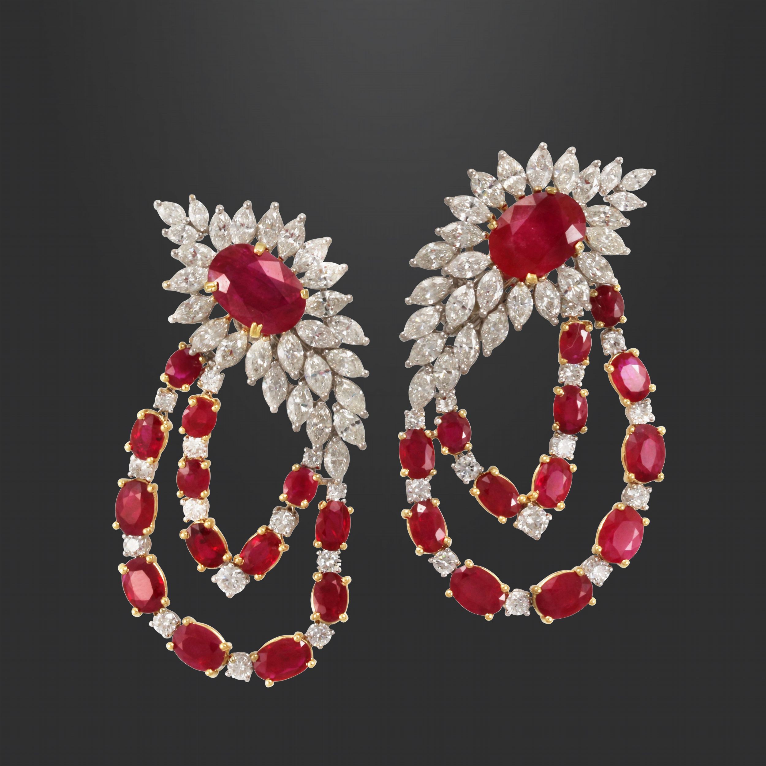 pendenti in oro bianco e giallo ciascuno con motivo superiore centrato da un rubino ovale contornato da diamanti navettes a sostegno di due morbide rivière di rubini alternati a brillanti, gr. 39,6. Diamanti del peso complessivo di 9 ct ca., due rubini del peso complessivo di 8 ct ca., restanti rubini del peso complessivo di 23 ct ca.