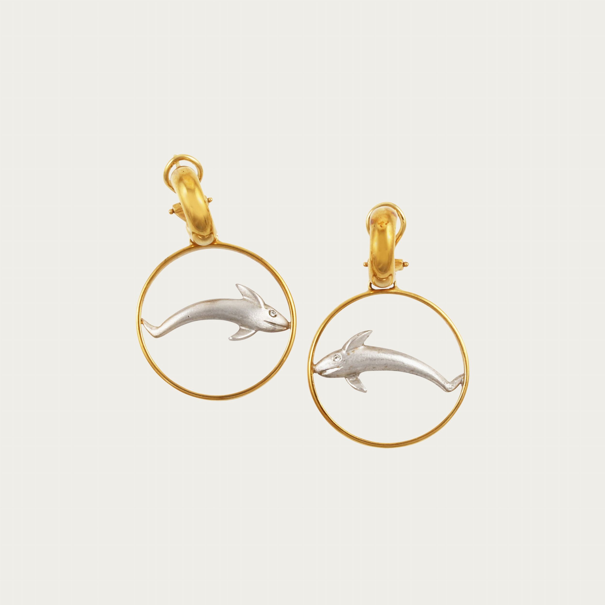 in oro giallo ciascuno con cerchio sospeso centrato da un delfino in oro bianco con piccolo brillante per occhio, gr. 23,7.Dimensioni 4,5 x 3 cm ca.