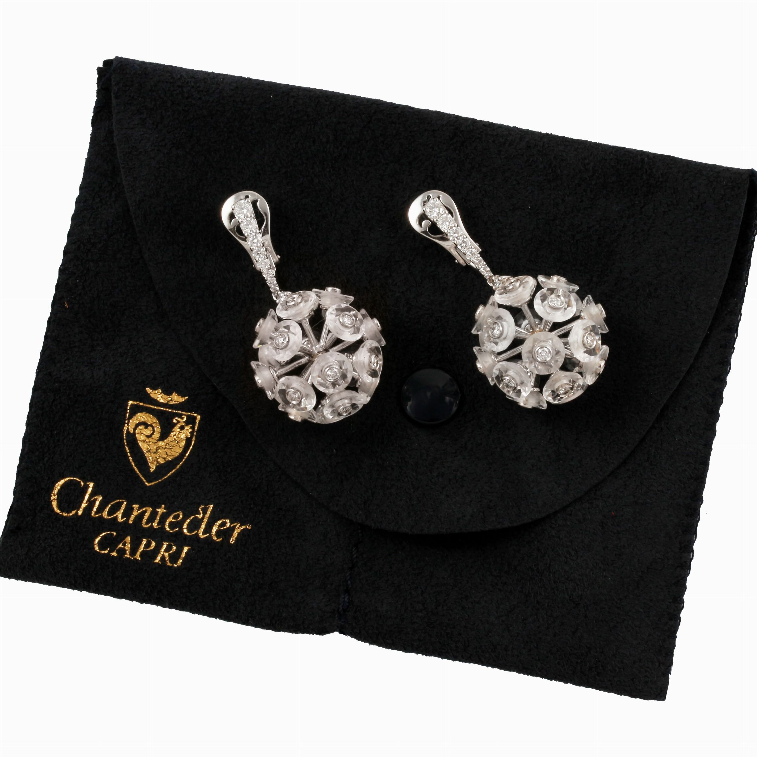in oro bianco, ciascuno con sfera sospesa composta da dischetti in cristallo di rocca e piccoli brillanti, gr. 14,8. Corredati da custodia originale.Lunghezza 3,5 cm ca.Firmati: Chantecler