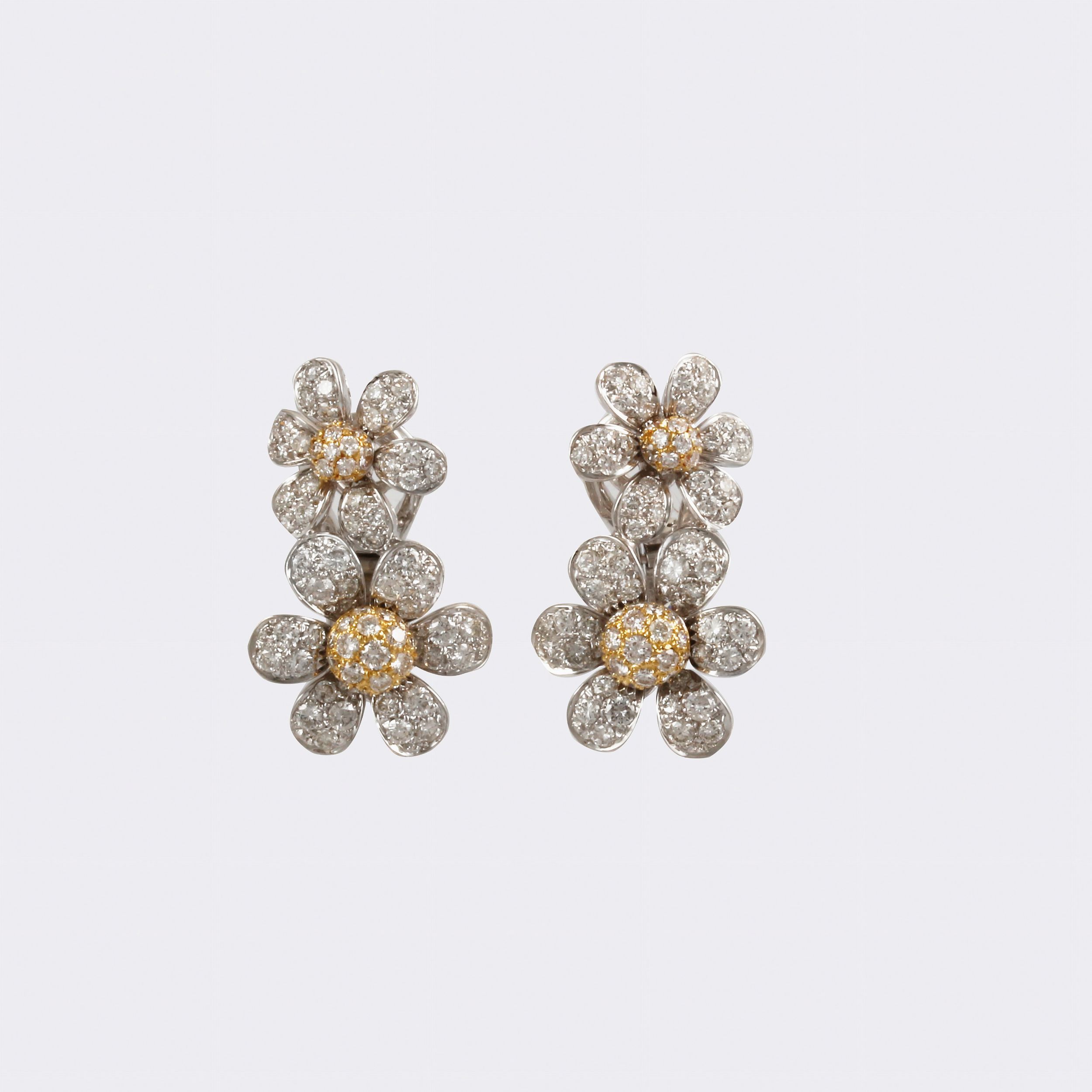 in oro giallo e bianco con margherite in pavé di brillanti del peso complessivo di 2,20 ct ca., gr. 14,6.Dimensioni 2,6 x 1,7 cm ca.Firmati: Chantecler