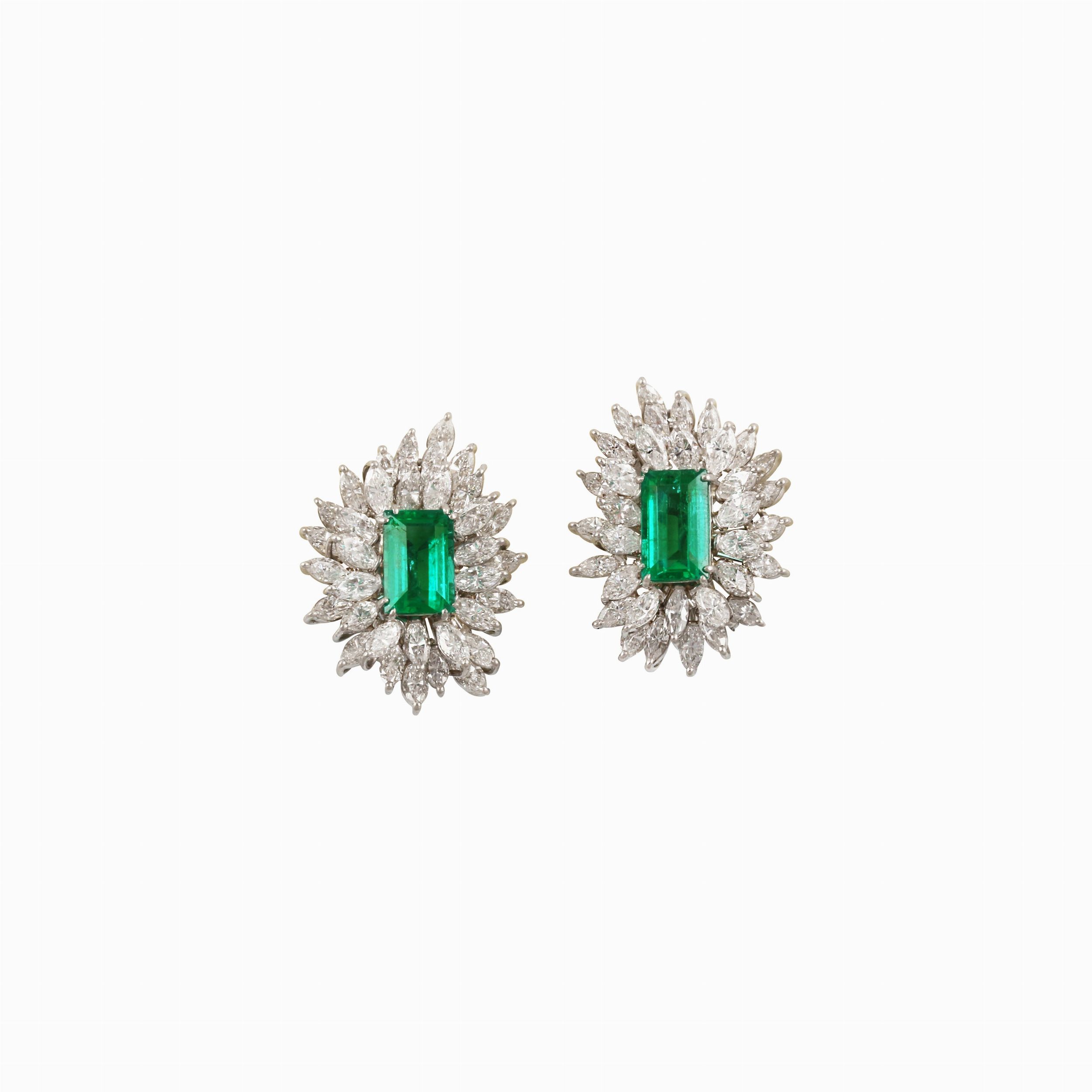 a clip realizzati in platino con smeraldi rettangolari del peso di 3,03 ct e 2,98 ct, contornati da un doppio giro di diamanti taglio navette del peso complessivo di 7 ct ca., gr. 20,8.