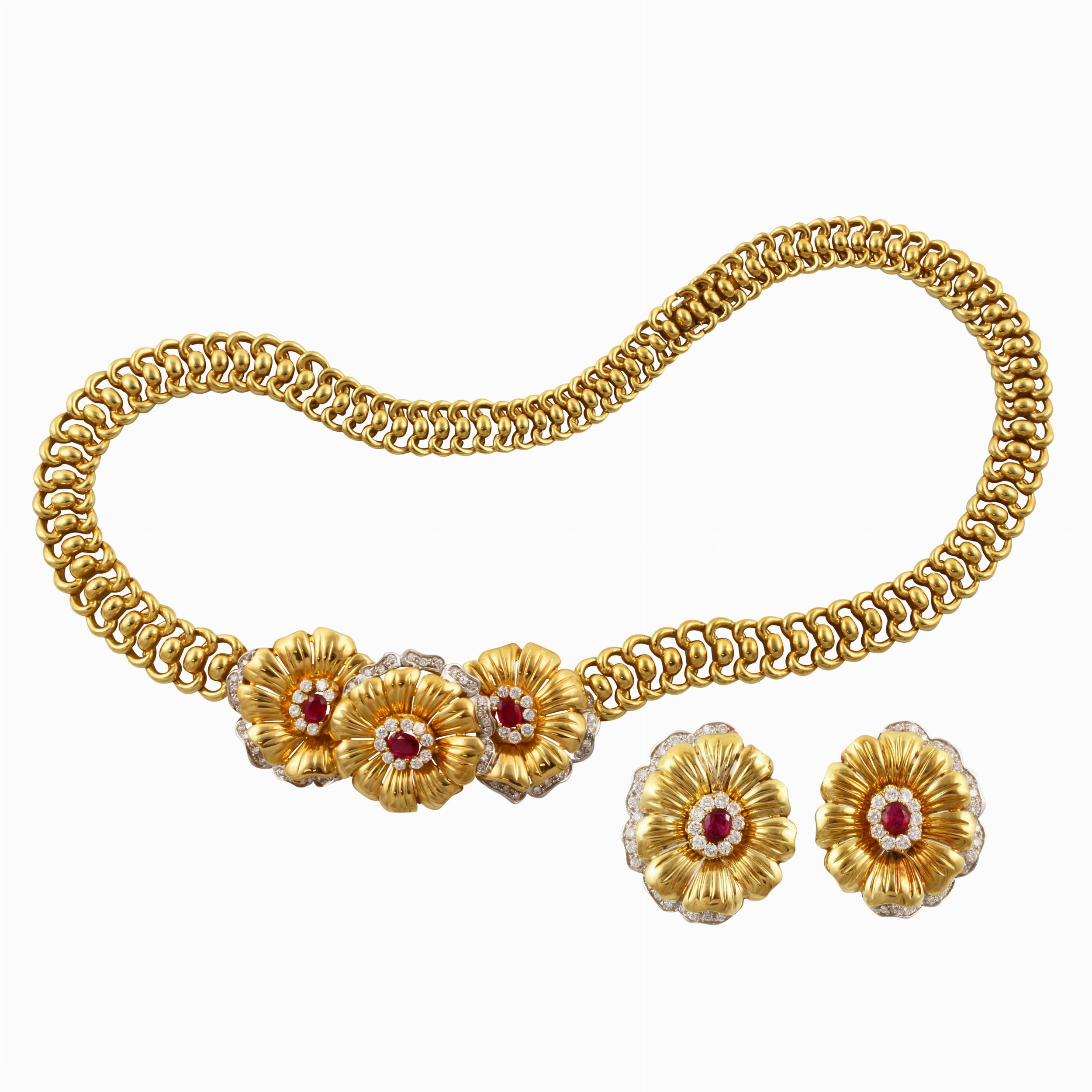 in oro giallo e bianco, composta da girocollo a nastro ornato al centro da tre fiori impreziositi da brillanti e rubini ovali, orecchini a clip en suite, gr. complessivi 182,7.Lunghezza 45 cm ca.Misura orecchini 3,2 x 2,8 cm ca.