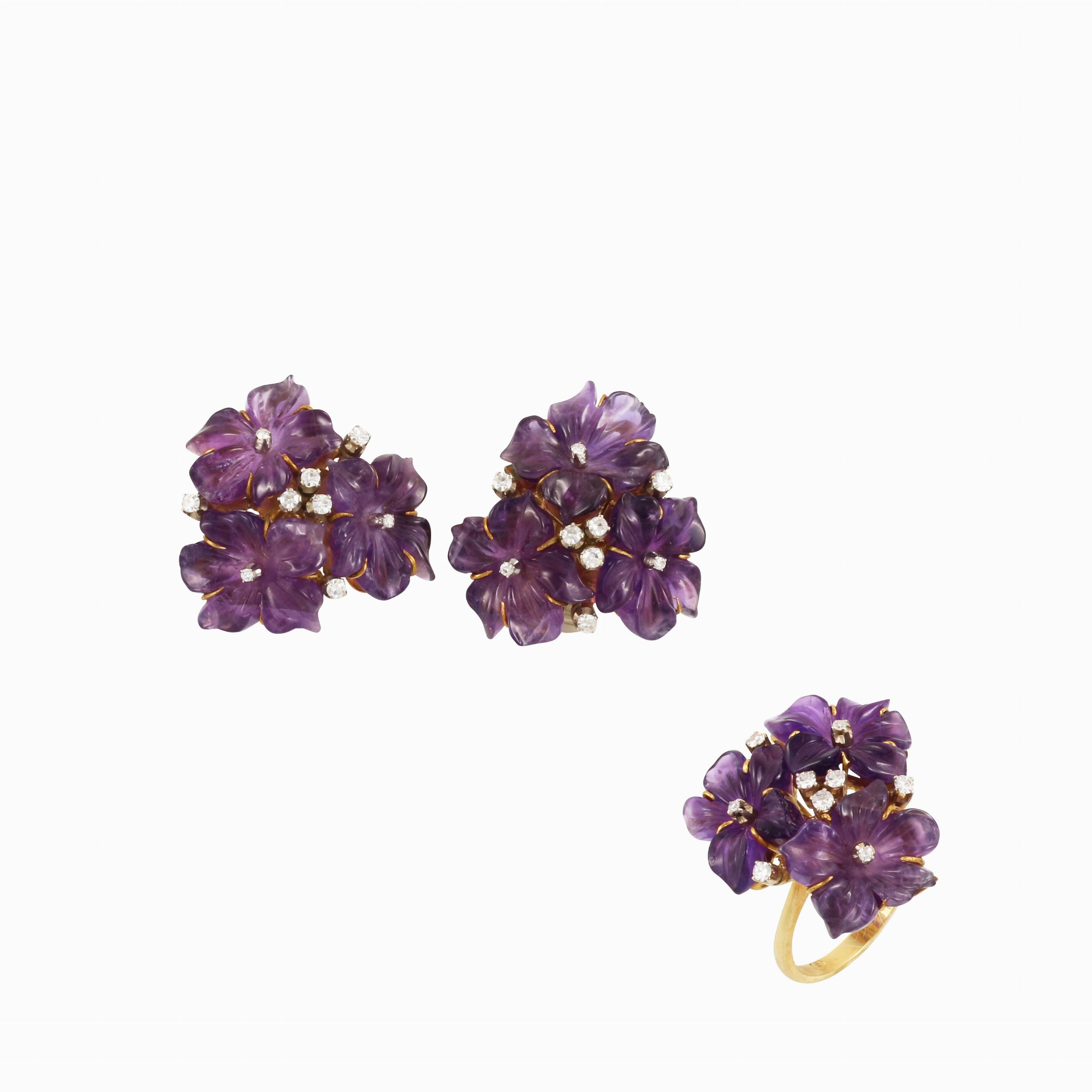 in oro giallo composta da anello e orecchini a clip raffiguranti un bouquet di fiori in ametista incisa (sbeccatura) con piccoli diamanti, gr. complessivi 29,9.Dimensioni orecchini 3 x 2,5 cm ca.Misura anello 17