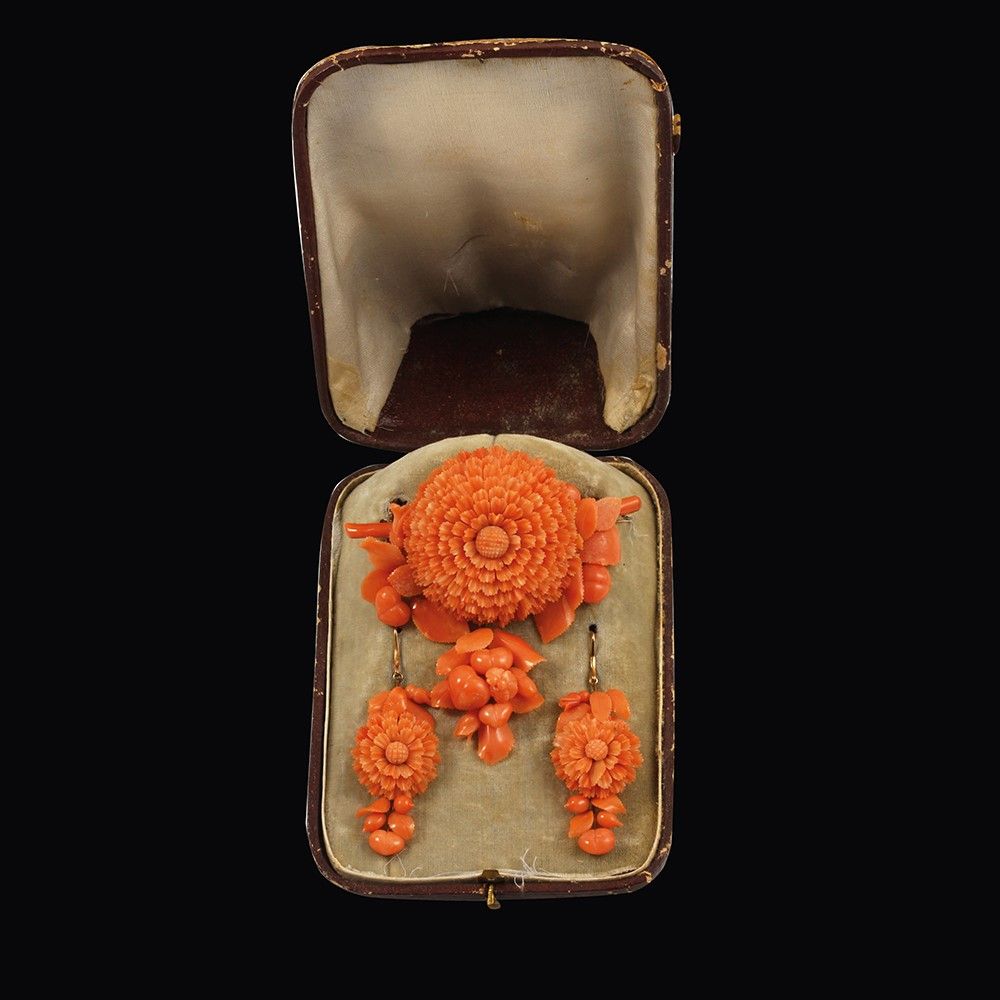 composta da spilla con pendente in corallo raffigurante una raffinata dalia fogliata su ramo e orecchini en suite, montature in oro, gr. 42,5. Corredata da custodia.Dimensioni spilla 8 x 7,3 cm ca.lunghezza orecchini 6 cm ca.