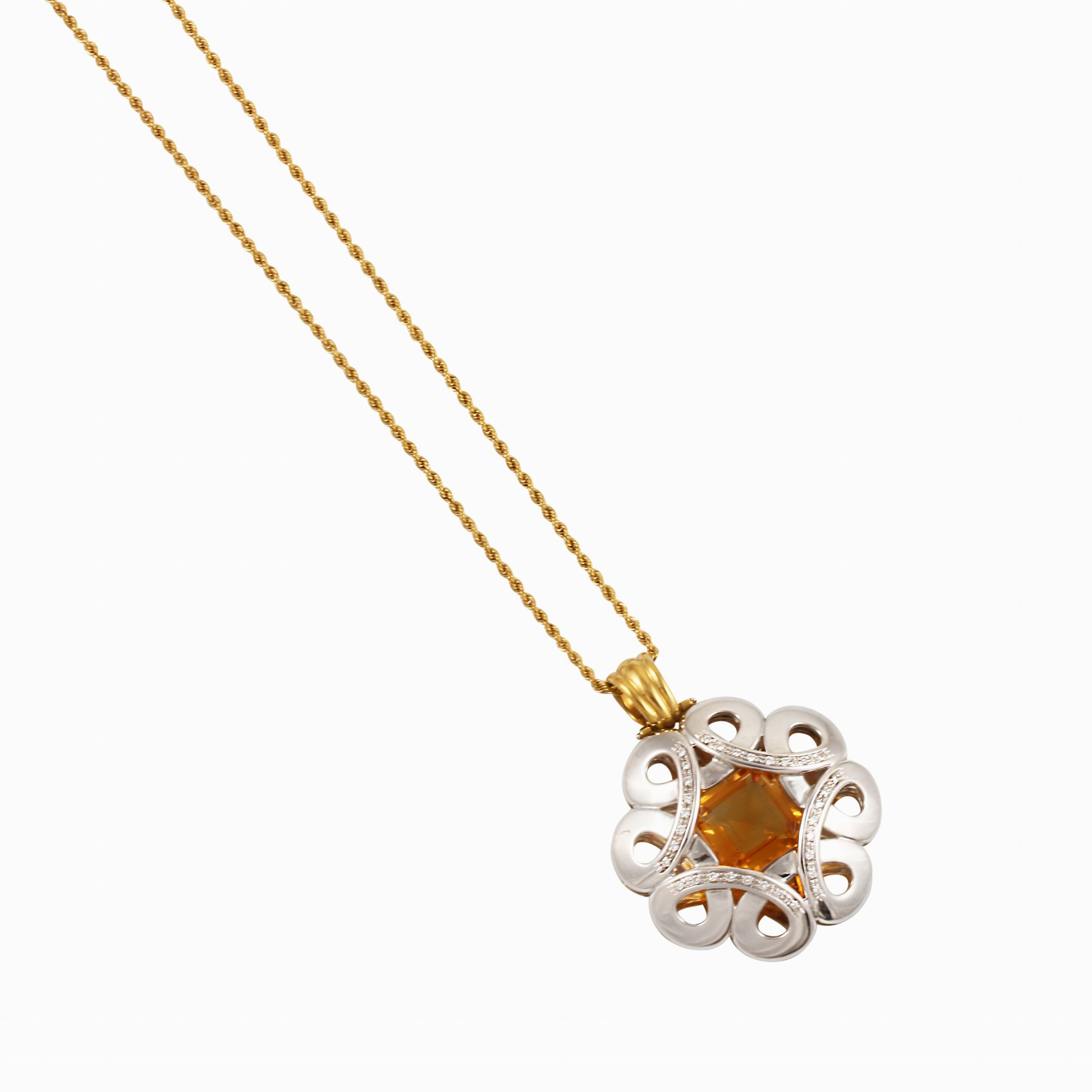 in oro bianco e giallo traforato a girandola con brillanti e quarzo citrino al centro, sostenuto da una catena in oro giallo a cordoncino ritorto, gr. complessivi 46,6.