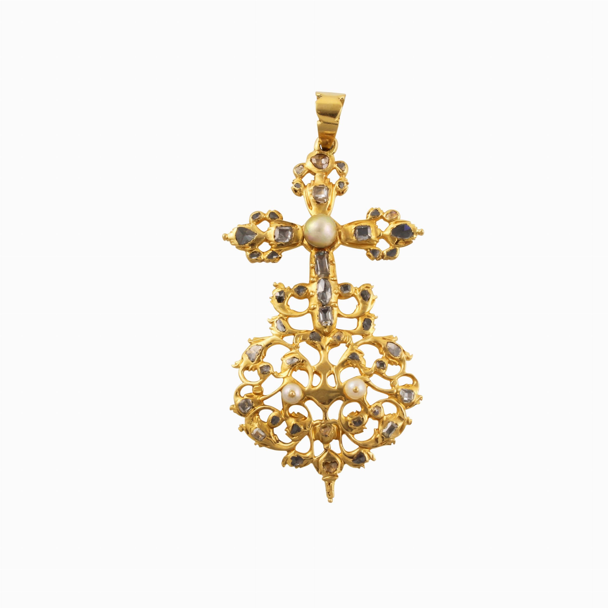 croce stilizzata traforata in oro giallo con diamanti taglio a rosa e perle, gr. 22,1.Dimensioni 8 x 4 cm ca.