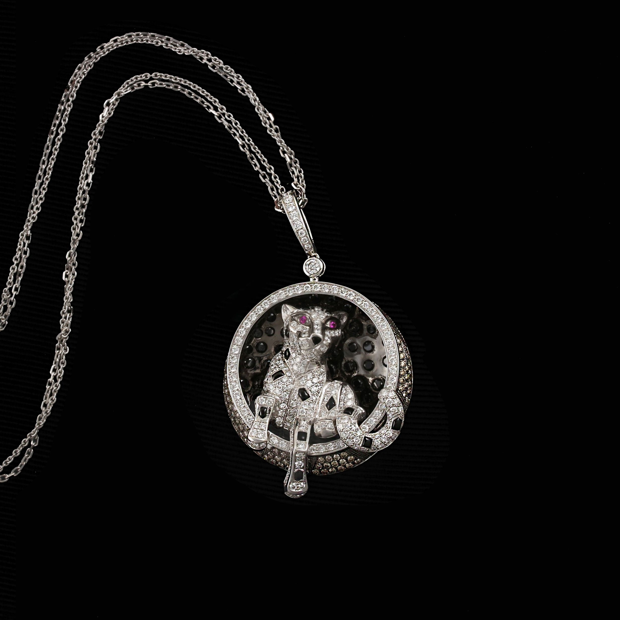 a forma circolare con pantera, realizzato in oro bianco e oro brunito impreziosito da brillanti incolori, brown e neri, onici e rubini, sostenuto da un girocollo a doppia catenina in oro bianco, gr. complessivi 30.