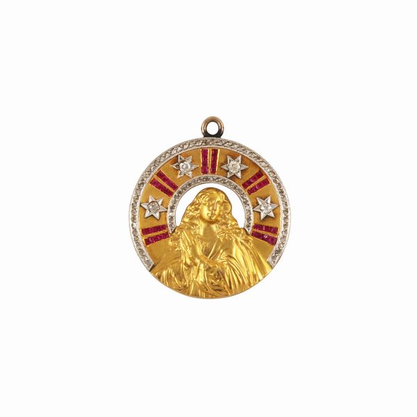 a forma circolare in oro giallo e platino con raffigurazione sacra ornato da piccoli diamanti e rubini, gr. 11,3.Diametro 3 cm ca.