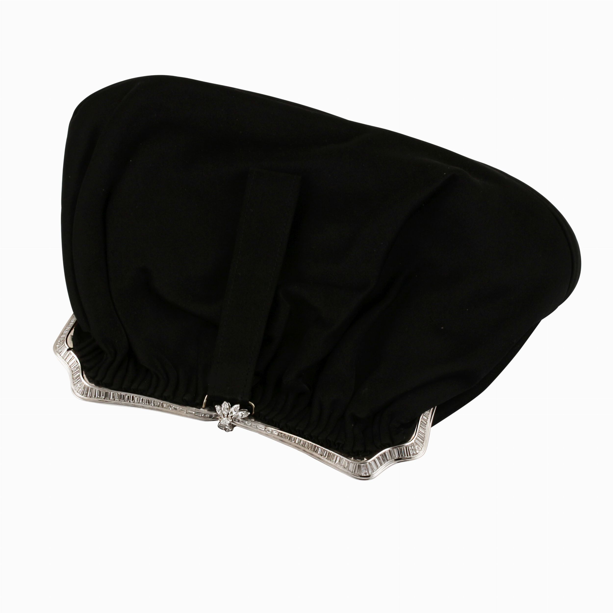 in raso nero con chiusura sagomata in oro bianco interamente percorsa da diamanti taglio baguette e taper, evidenziata al centro da diamanti navettes disposti a formare un motivo floreale stilizzato. Diamanti del peso complessivo di 20 ct ca.