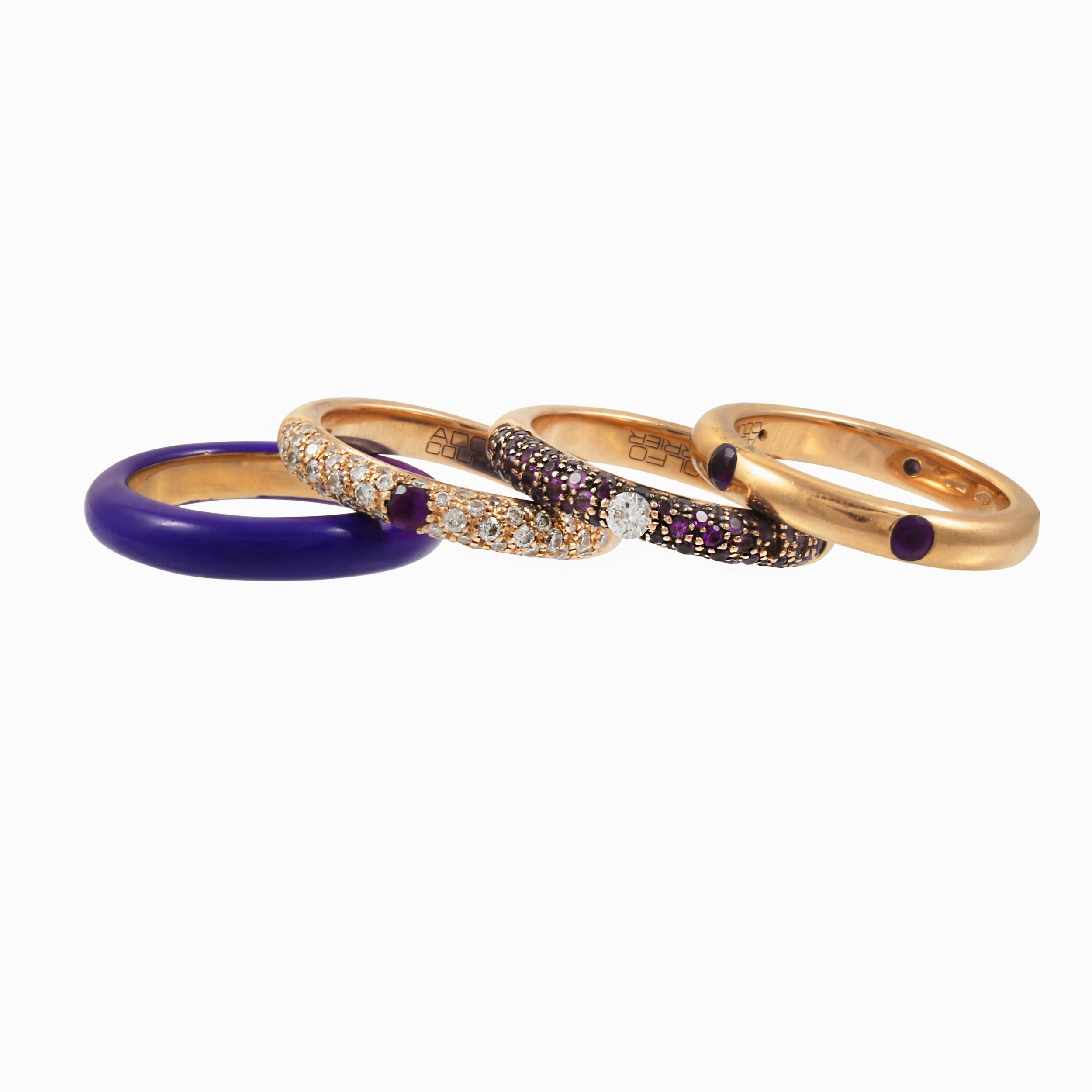 in oro rosa con ametiste (una mancante), brillanti e smalto viola, gr. complessivi 28,8.Misura 18Firmate: Adolfo Courrier