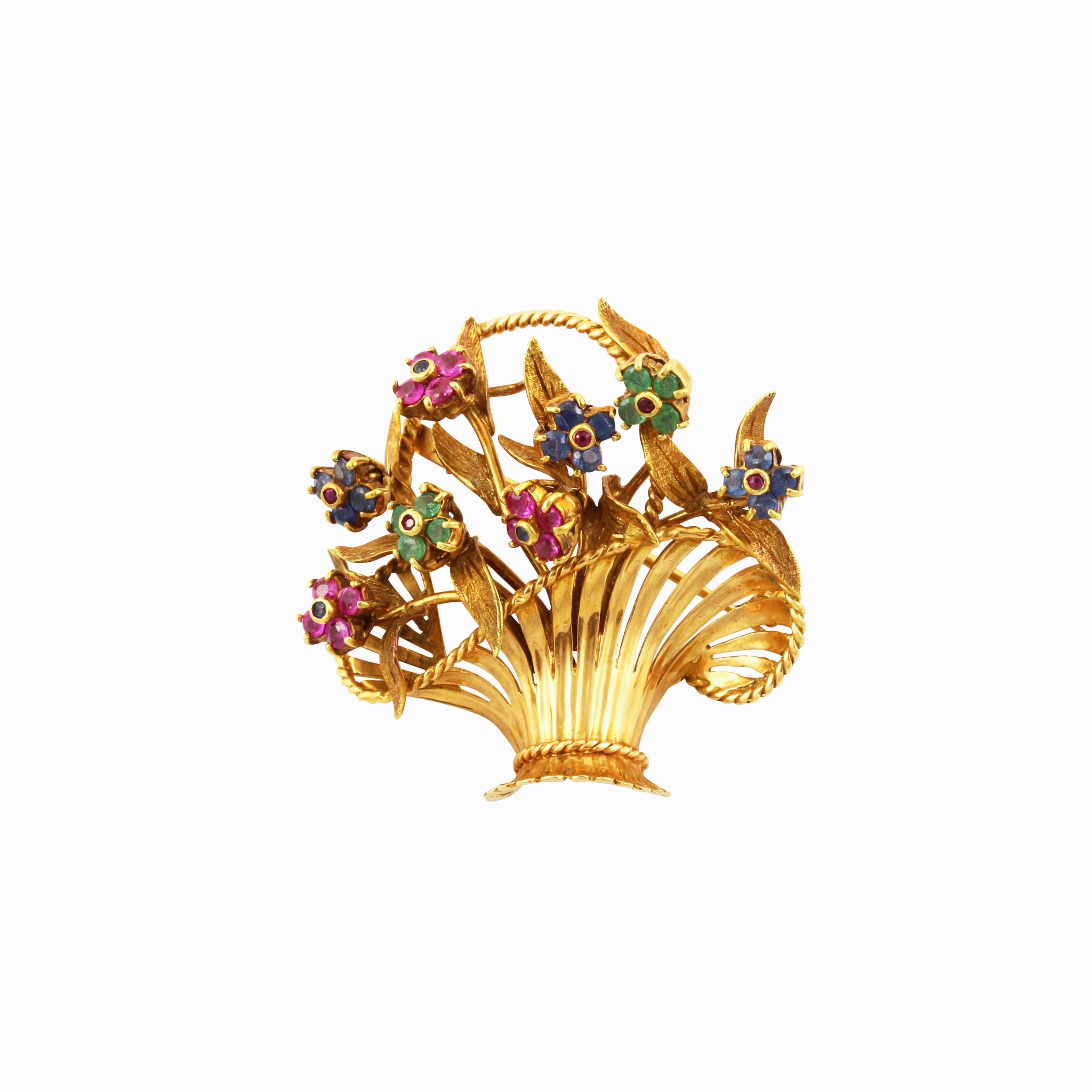 in oro giallo a guisa di cestino con fiori en tremblant in zaffiri, rubini e smeraldi, gr. 15.Dimensioni 3,5 x 4 cm ca.Anni '50