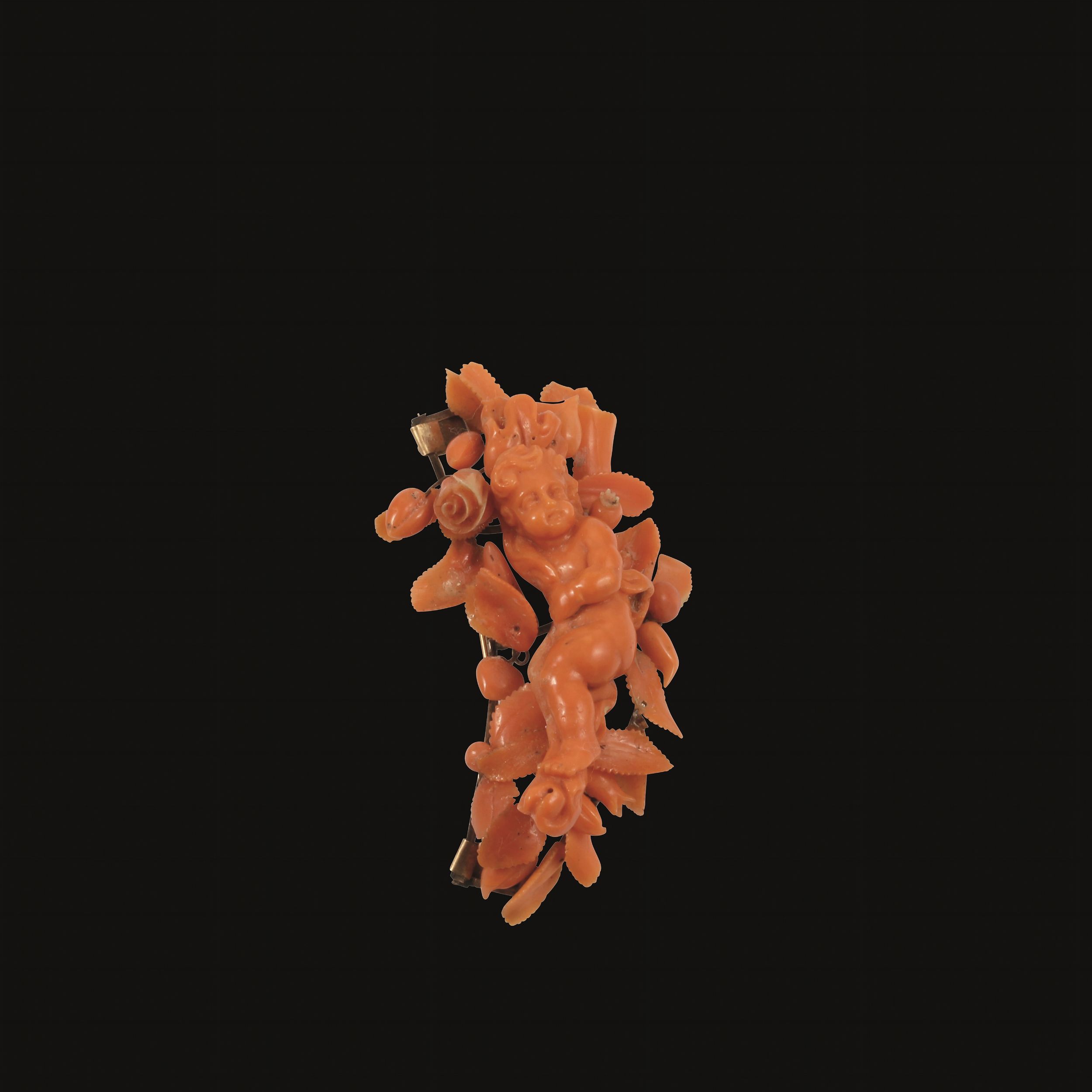 in corallo raffigurante un putto con fiori e foglie, montatura in oro a titolo basso, gr. 19,1.Dimensioni 7 x 4 cm ca.