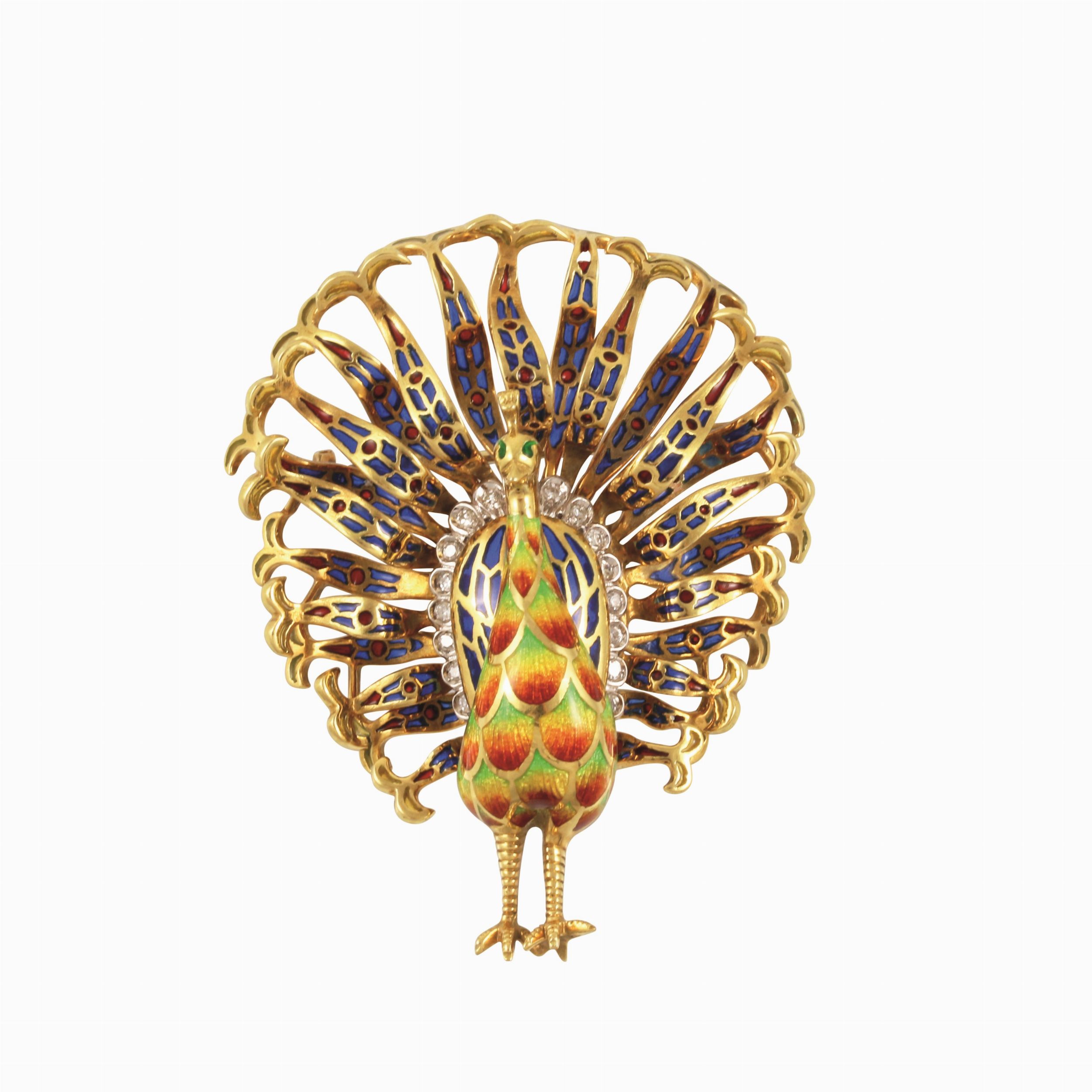 in oro giallo e bianco a guisa di pavone ornato da smalti policromi (lievi mancanze) e diamanti, gr. 33,7.Dimensioni 6 x 5 cm ca.