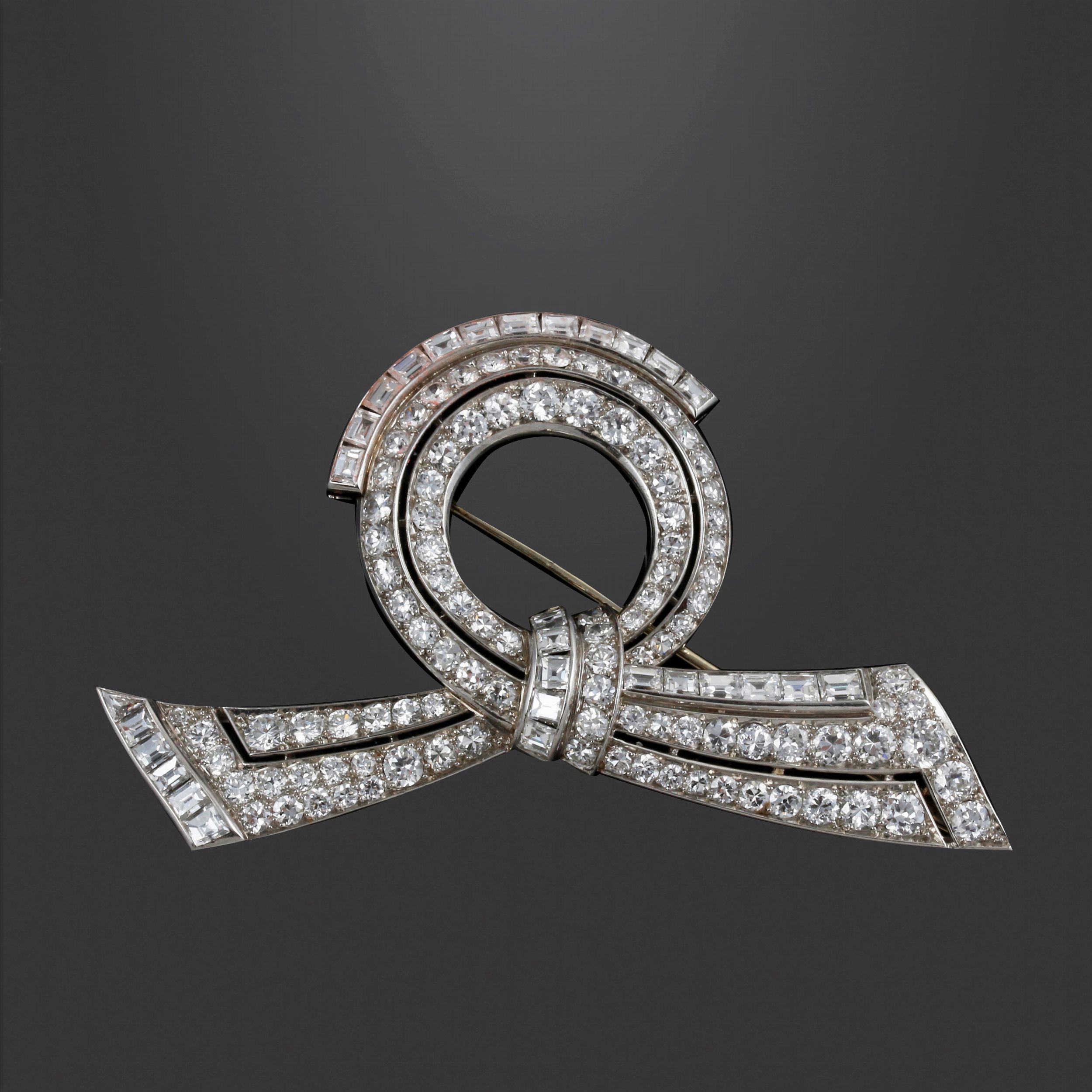a coccarda interamente realizzata in platino e diamanti del peso complessivo di 7 ct ca., 25,3 gr.Dimensioni 7,5 x 4,5 cm ca.Inscritto: Cartier Paris 134726Anni '30