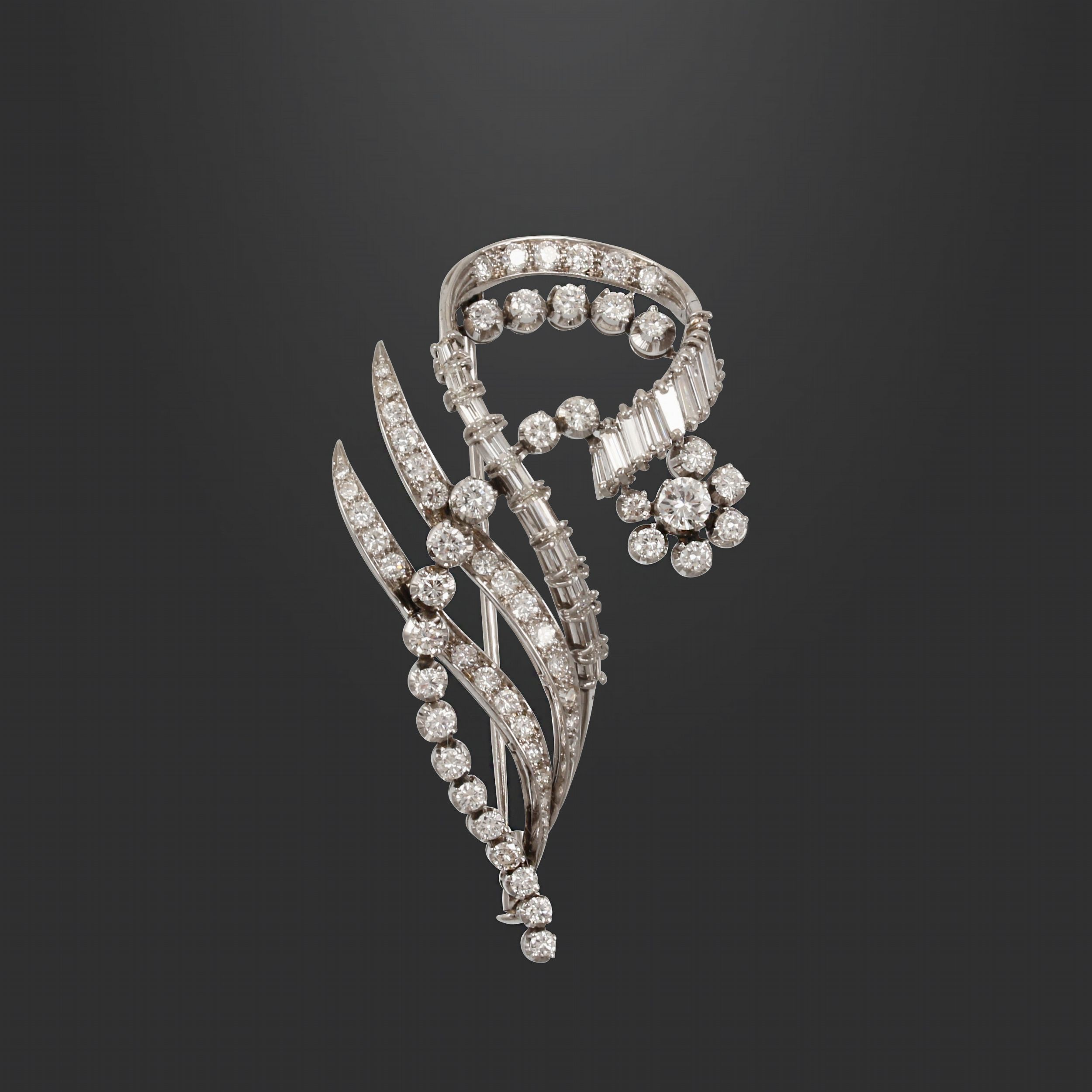 in oro bianco a motivo vegetale con brillanti, diamanti baguettes del peso complessivo di 2,50 ct ca., gr. 9,5.Dimensioni 5 x 3 cm ca.