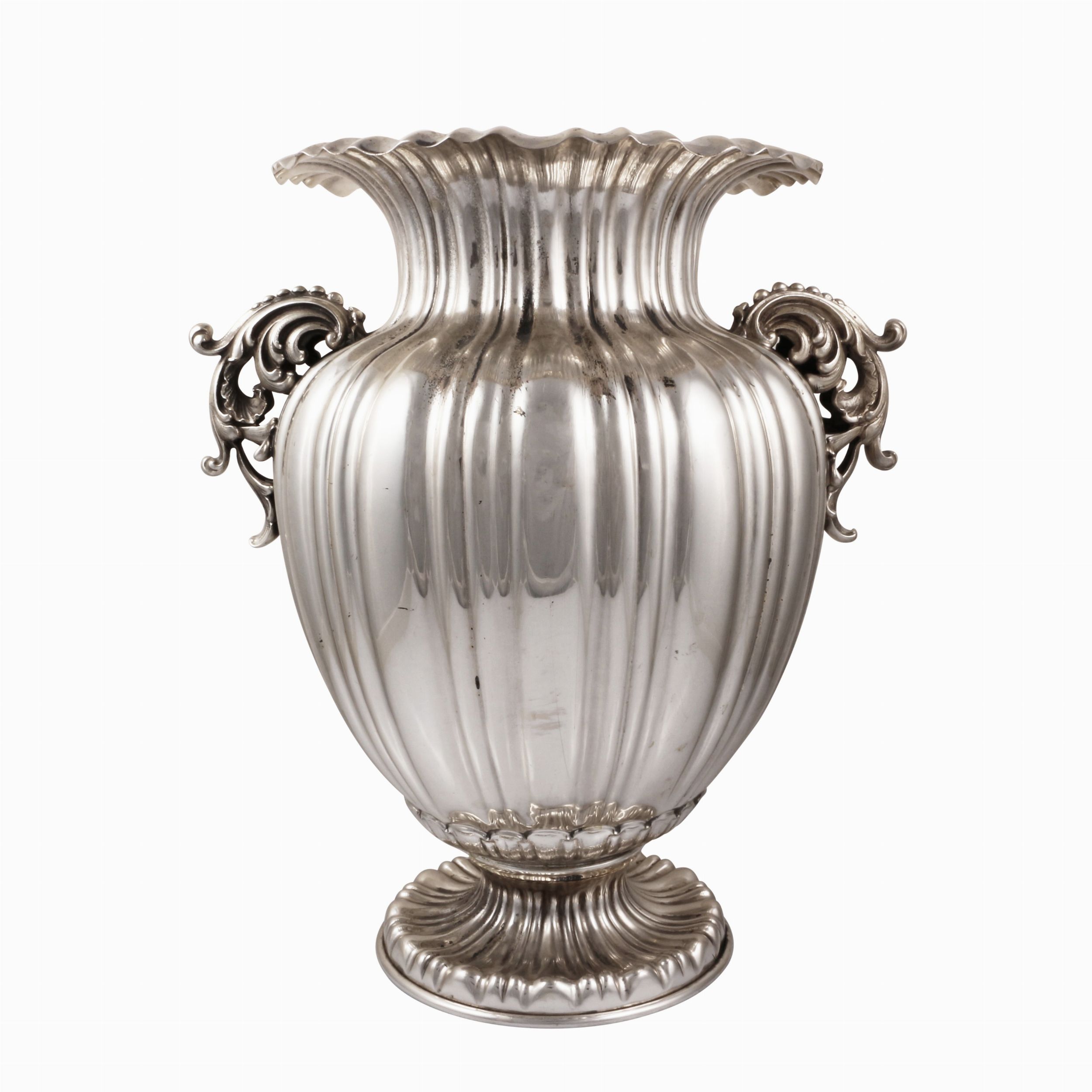 in argento 800, corpo ad anfora, segnato da nervature baccellate, su piede circolare, bocca svasata e prese a rocailles fogliate, gr. 1.700 ca.Dimensioni 30 x 20 cm ca.Firmato: L.V. CassinaNumerario: 23 MI (Genazzi Luigi - Milano)