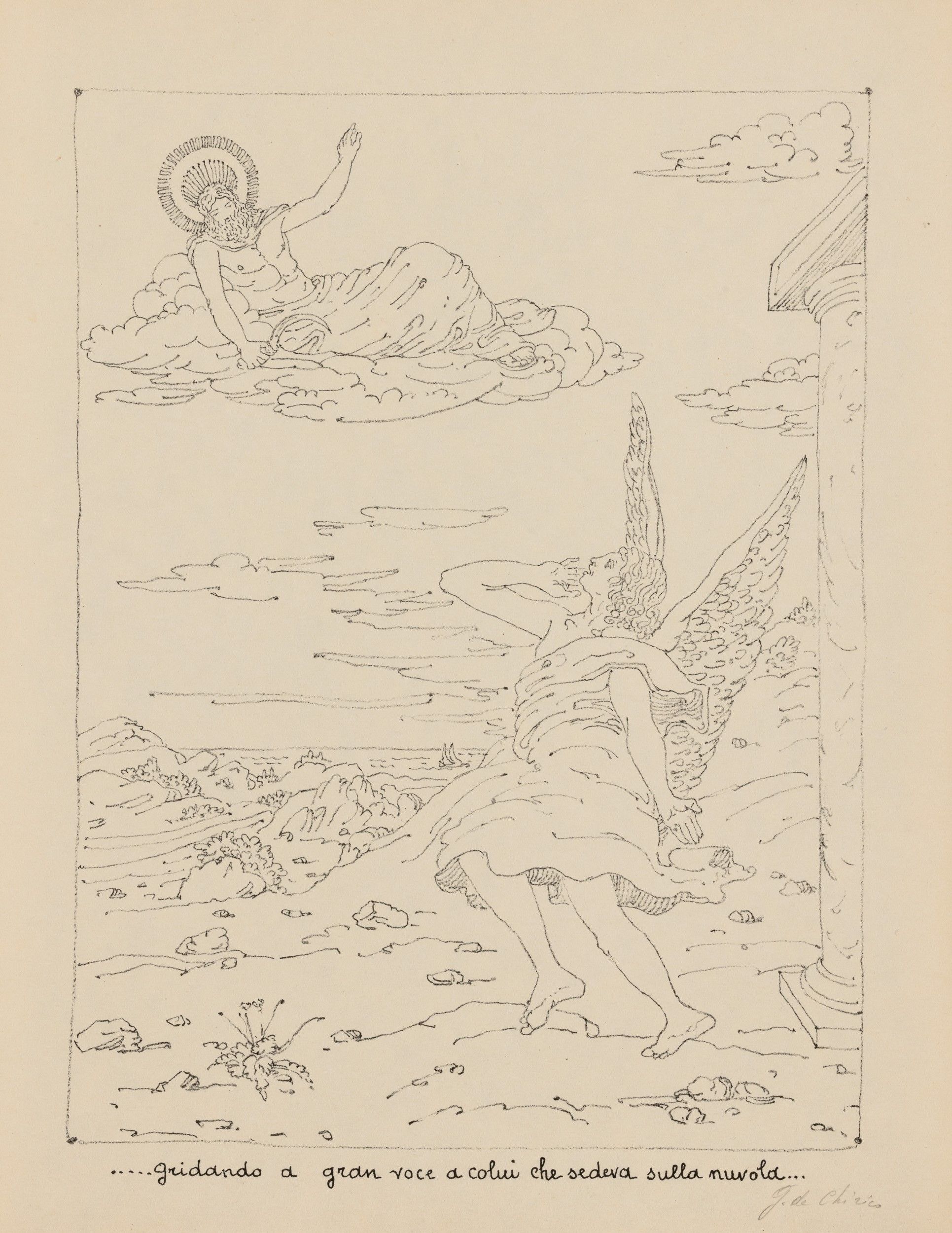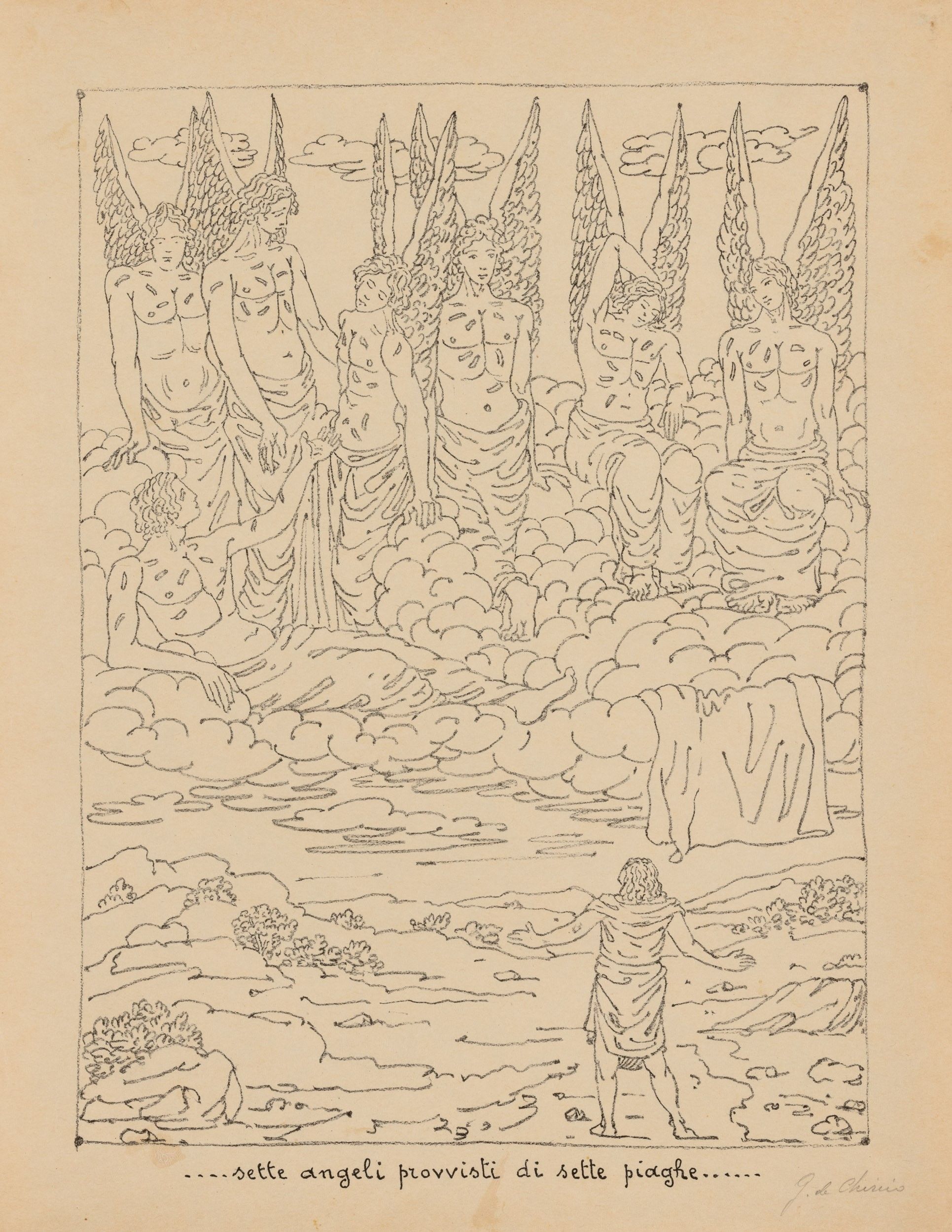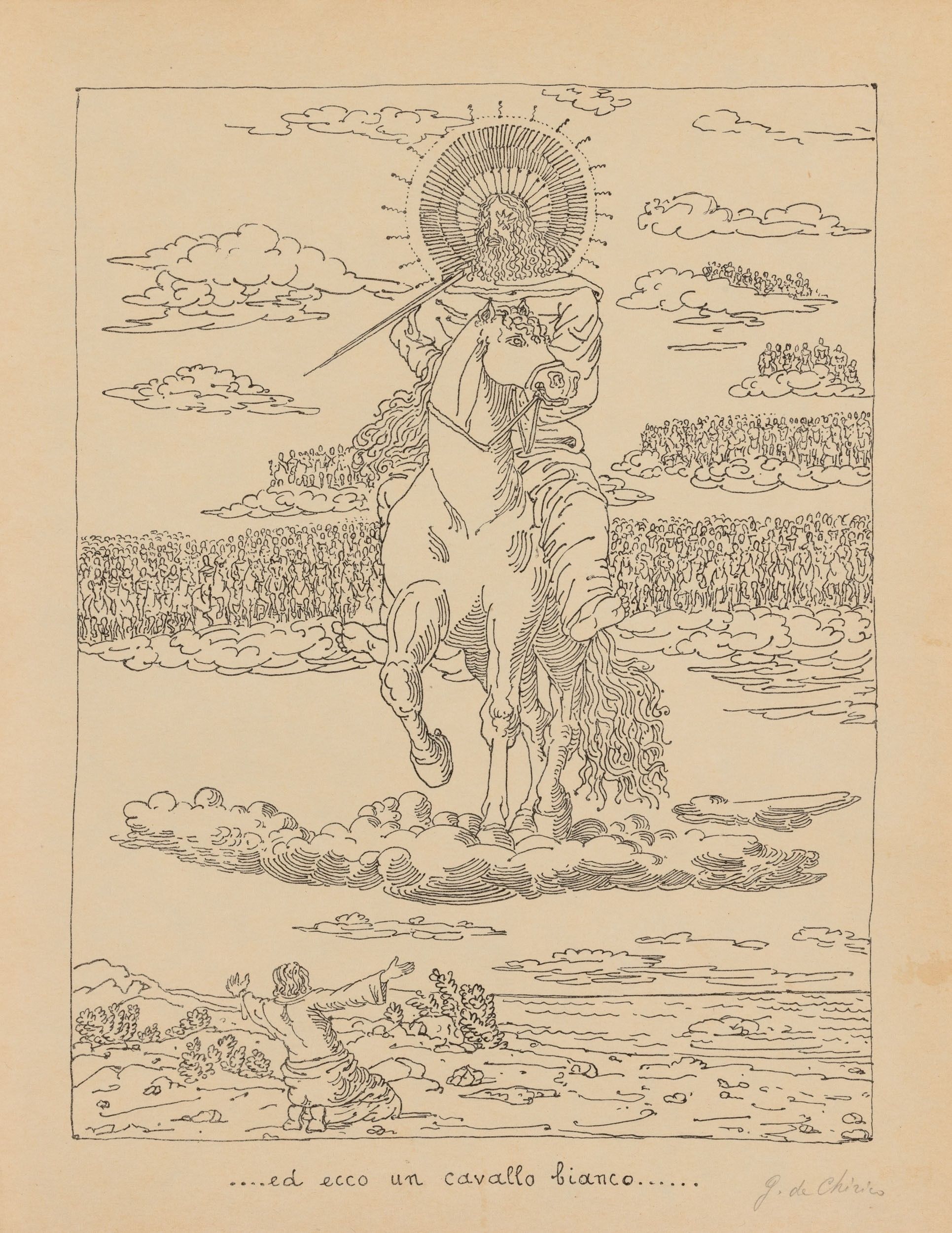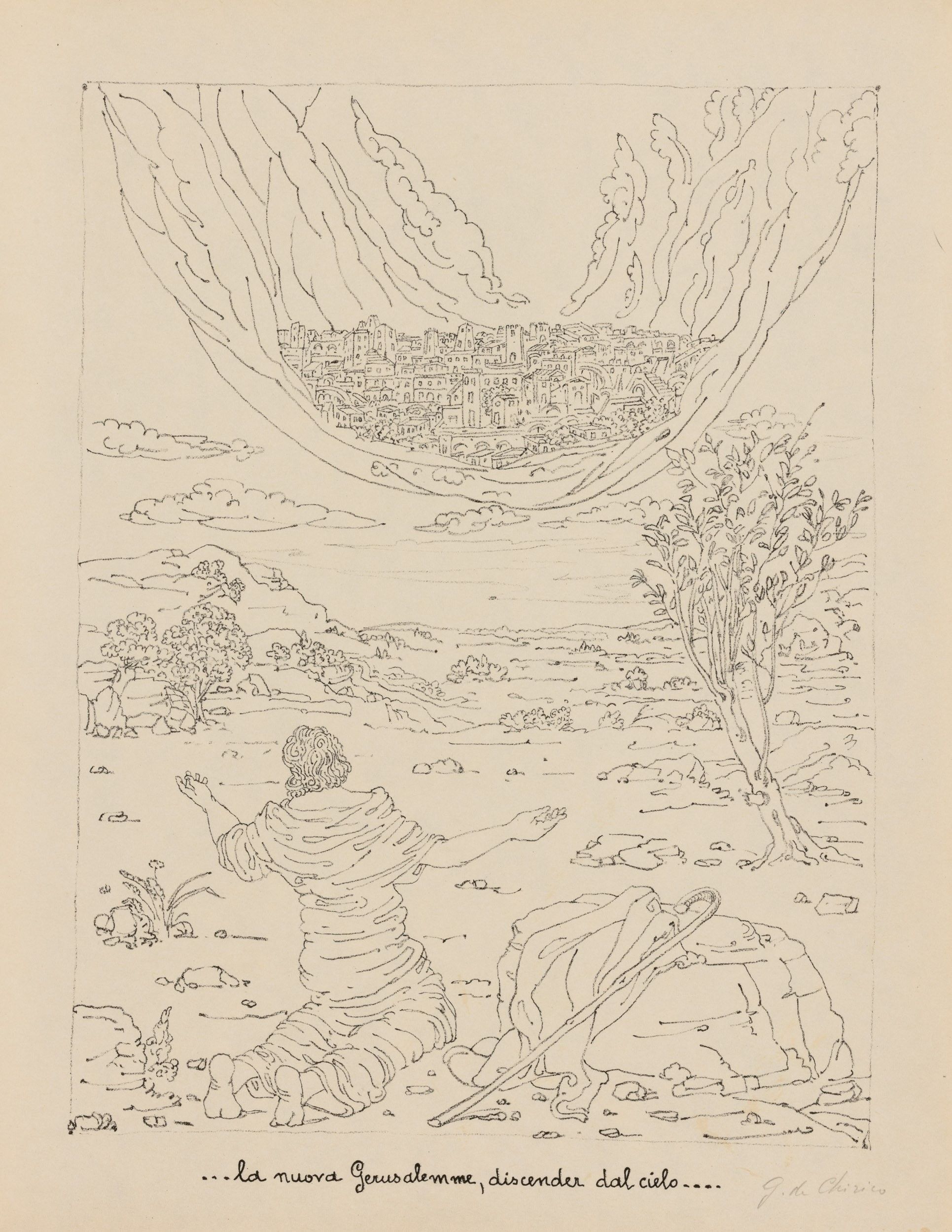 venti litografie tirate a mano nello studio di Piero Fornasetti, Largh. 27,4 - Alt. 35 Cm 1941 ciascuna litografia è firmata in basso a destra Edizioni Della Chimera, Milano 1. Io sono l'Alfa e l'Omega 2. Qualcuno, simile ad un figliolo d'uomo 3. Ed ecco un trono stava nel cielo 4. E gli fu data una corona 5. Il suo nome e' Morte e L'Orco lo accompagnava 6. E gli fu data una grande spada 7. Aveva una bilancia nella sua mano 8. E le stelle caddero sulla Terra 9. Sette Angeli provvisti di sette pieghe 10. E mi disse: prendi a divoralo! 11. E ci fu una grand guerra nel cielo 12. Una donna ravvolta nel sole 13. Ed ecco un gran drago 14. E vidi una bestia salire dal mare 15. Gridando a gran voce a colui che e' seduto sulla nuvola 16. Dopo questo, vidi una grande folla 17. Ed ecco un cavallo bianco 18. La nuova Gerusalemme discende dal cielo 19. Un fiume d'acqua viva 20. Caddi per adorare ai piedi dell'angelo