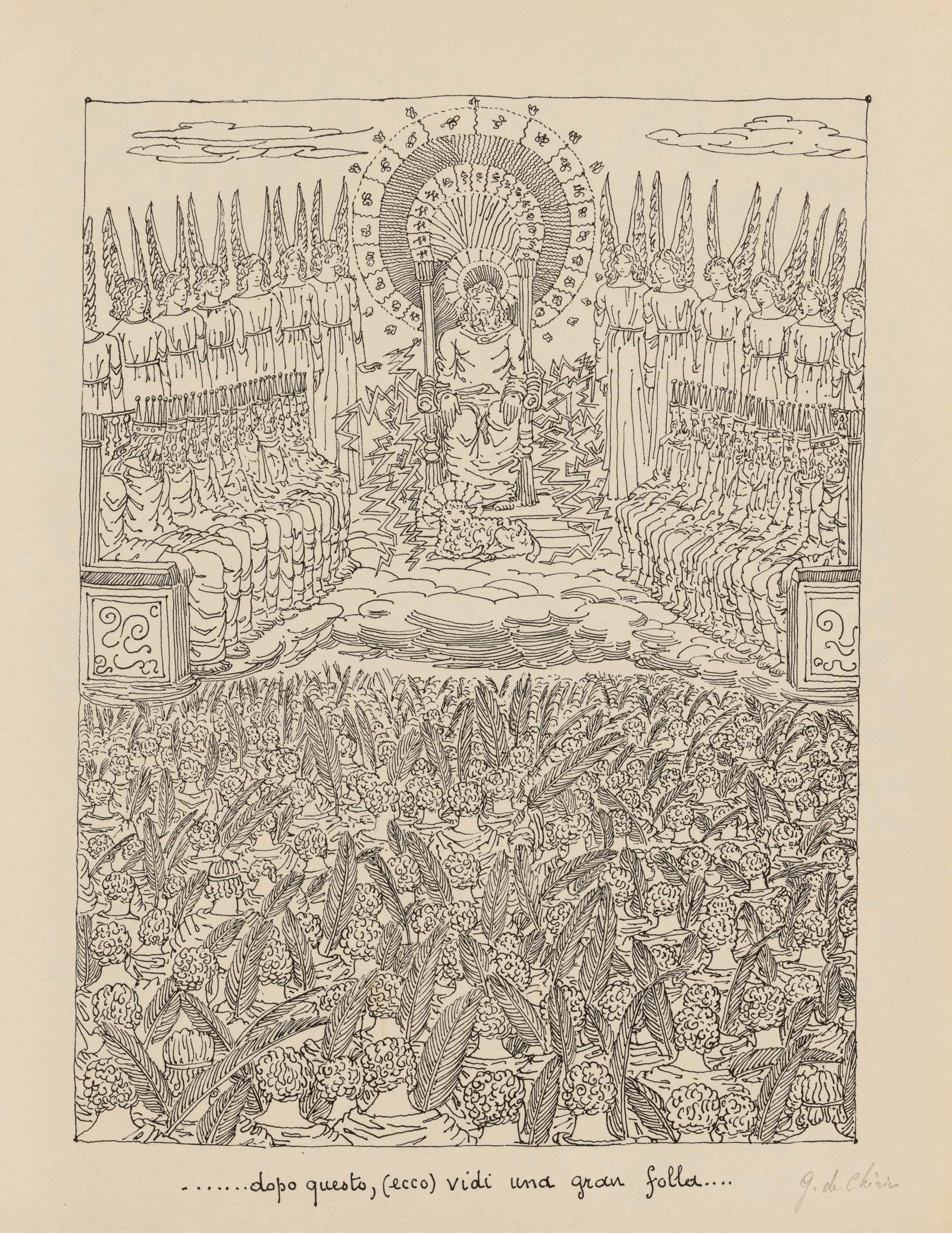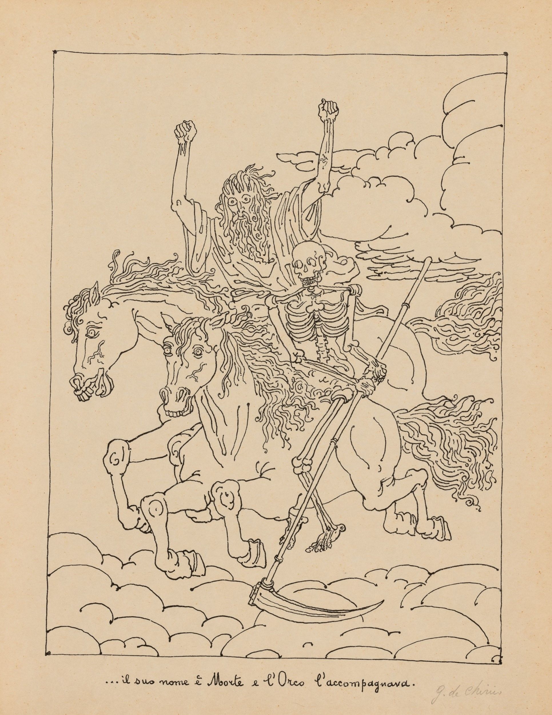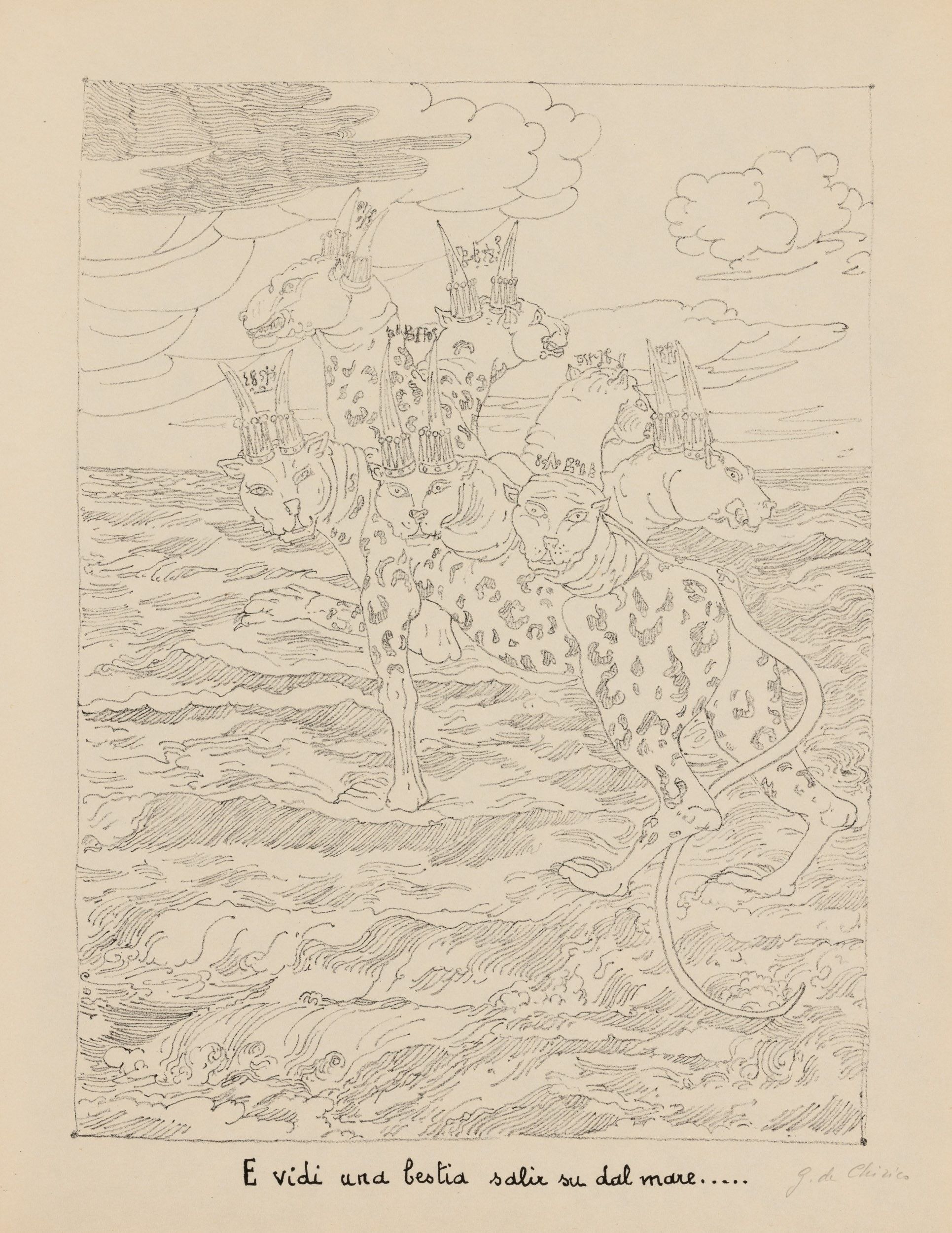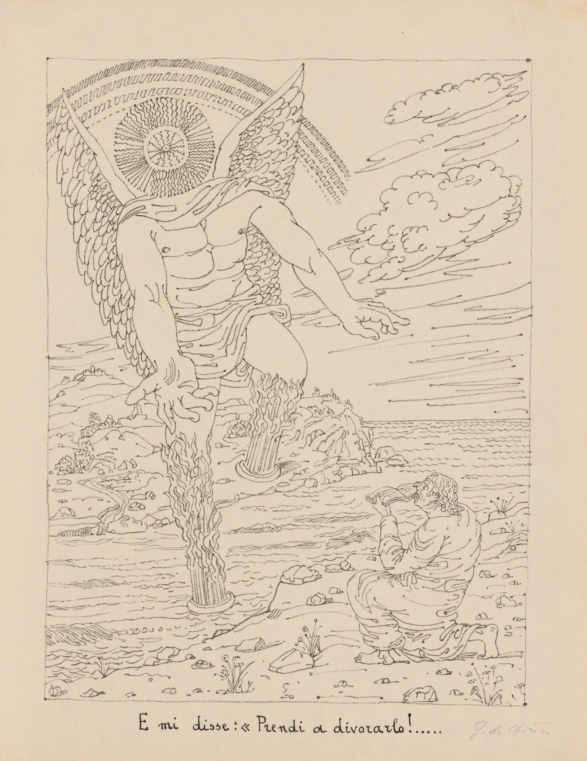 venti litografie tirate a mano nello studio di Piero Fornasetti, Largh. 27,4 - Alt. 35 Cm 1941 ciascuna litografia è firmata in basso a destra Edizioni Della Chimera, Milano 1. Io sono l'Alfa e l'Omega 2. Qualcuno, simile ad un figliolo d'uomo 3. Ed ecco un trono stava nel cielo 4. E gli fu data una corona 5. Il suo nome e' Morte e L'Orco lo accompagnava 6. E gli fu data una grande spada 7. Aveva una bilancia nella sua mano 8. E le stelle caddero sulla Terra 9. Sette Angeli provvisti di sette pieghe 10. E mi disse: prendi a divoralo! 11. E ci fu una grand guerra nel cielo 12. Una donna ravvolta nel sole 13. Ed ecco un gran drago 14. E vidi una bestia salire dal mare 15. Gridando a gran voce a colui che e' seduto sulla nuvola 16. Dopo questo, vidi una grande folla 17. Ed ecco un cavallo bianco 18. La nuova Gerusalemme discende dal cielo 19. Un fiume d'acqua viva 20. Caddi per adorare ai piedi dell'angelo
