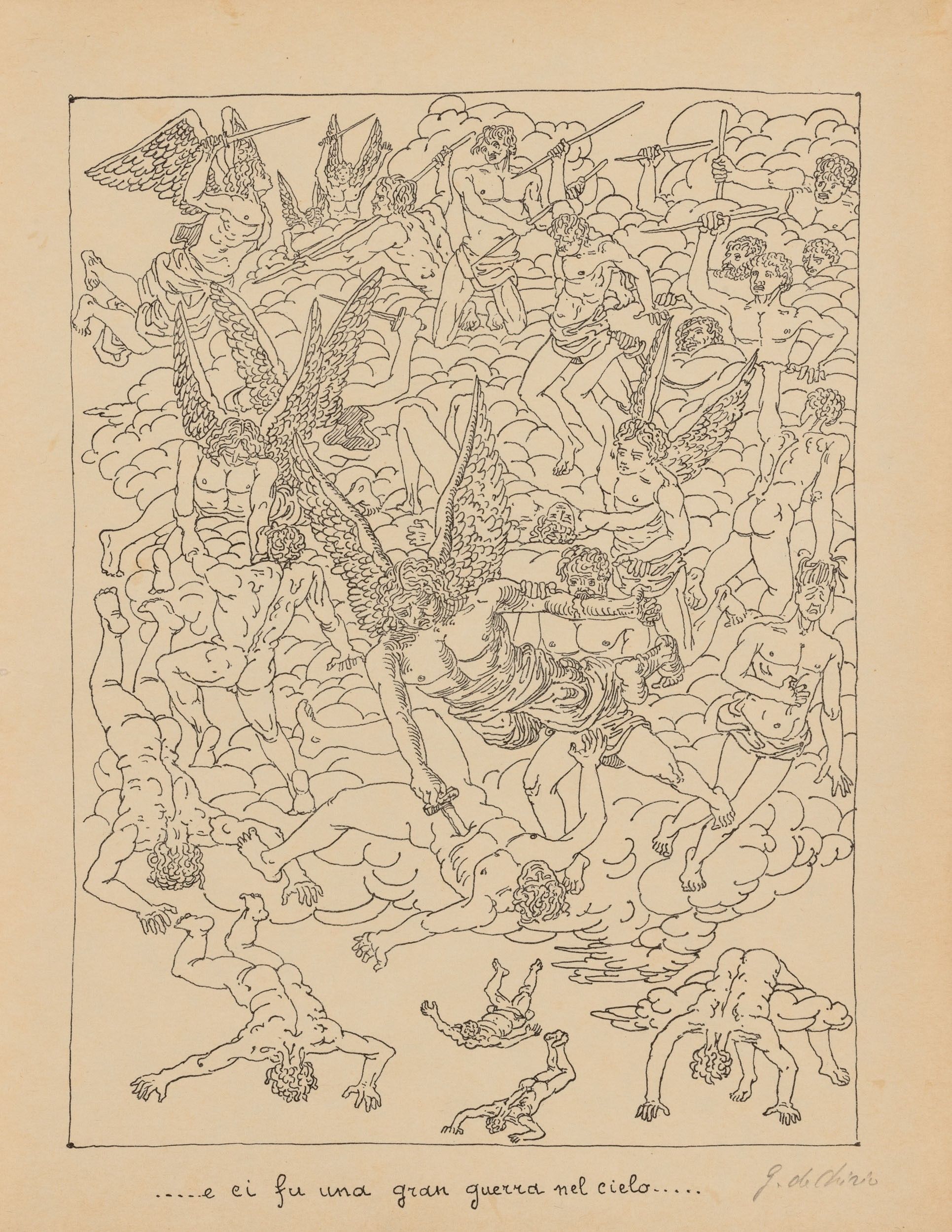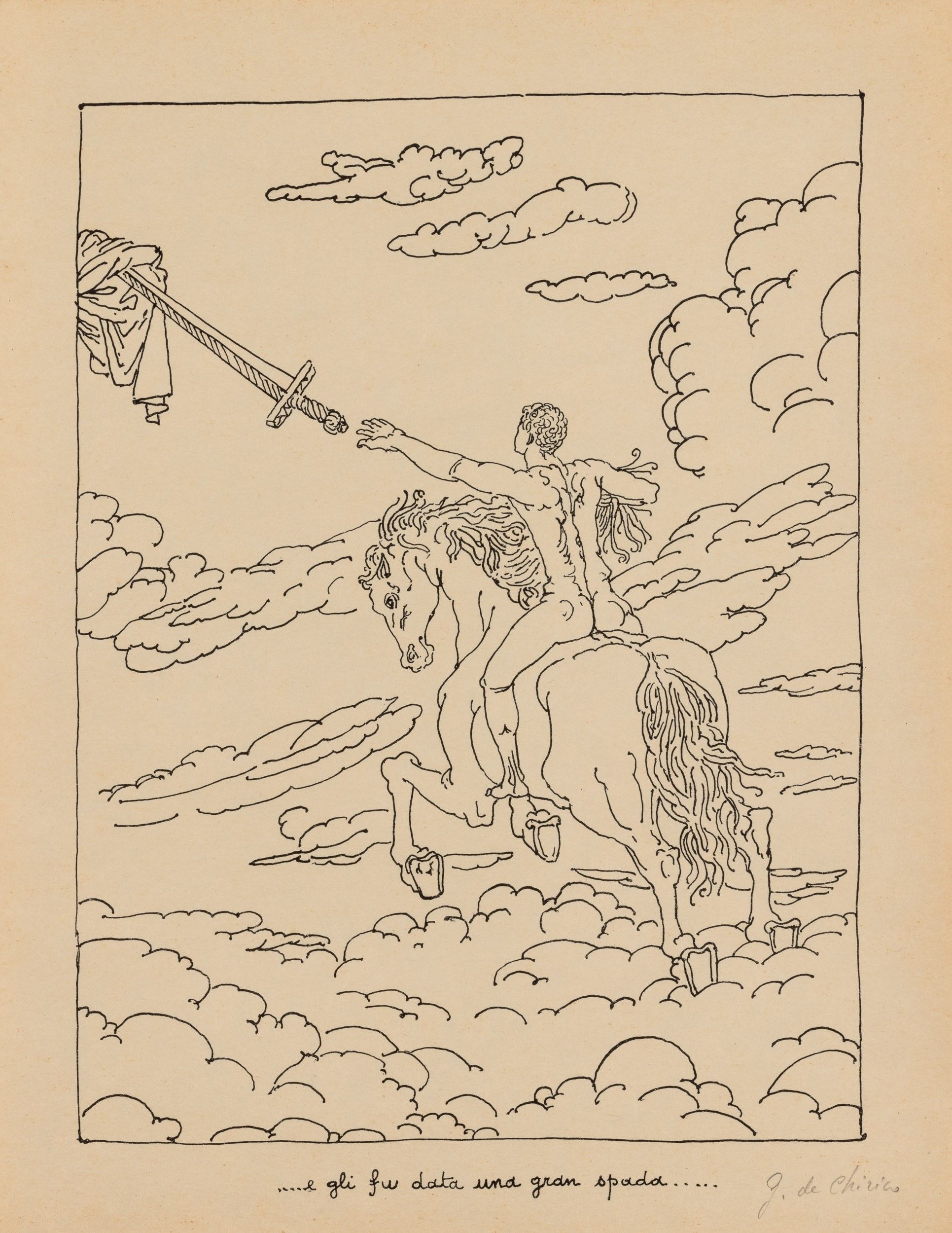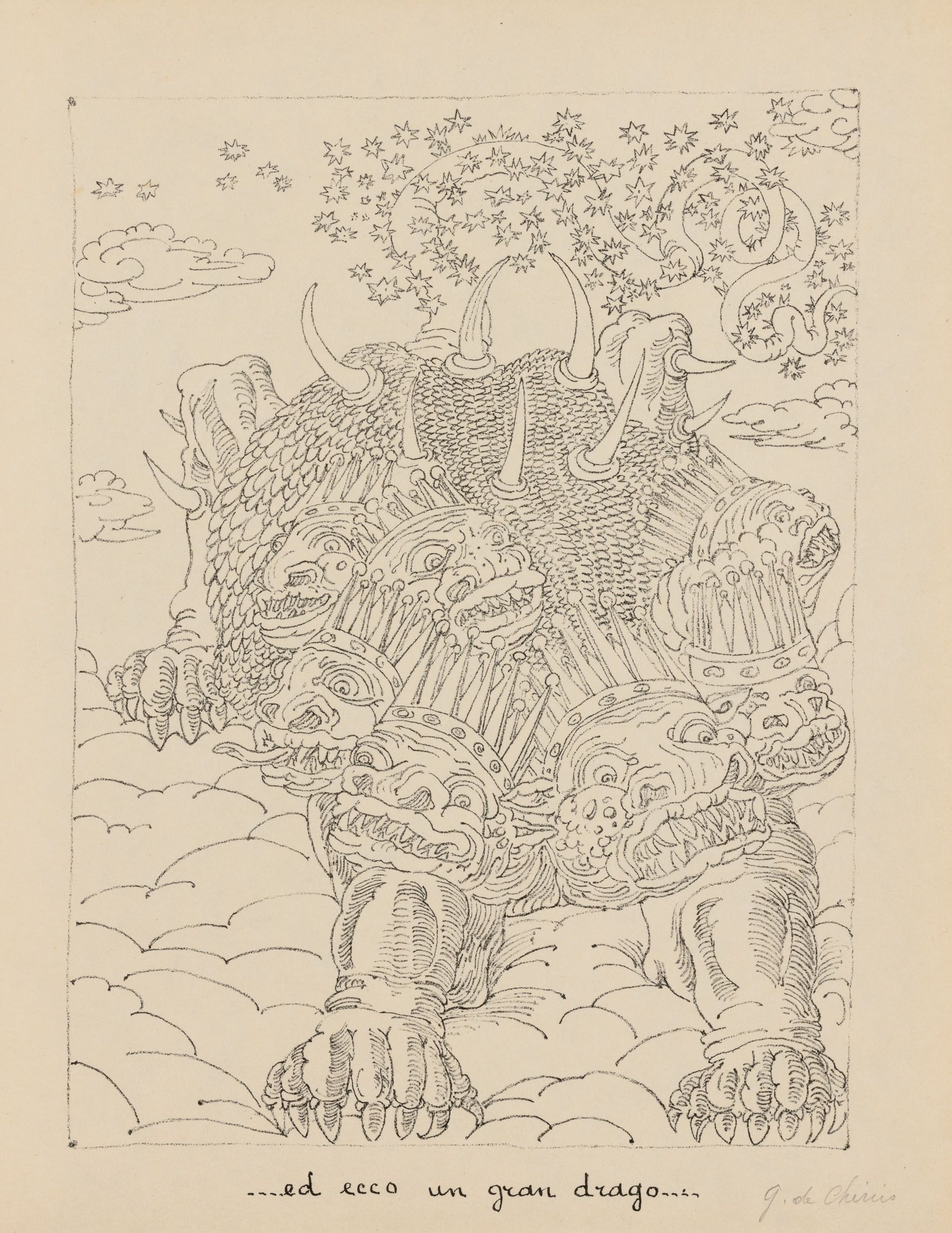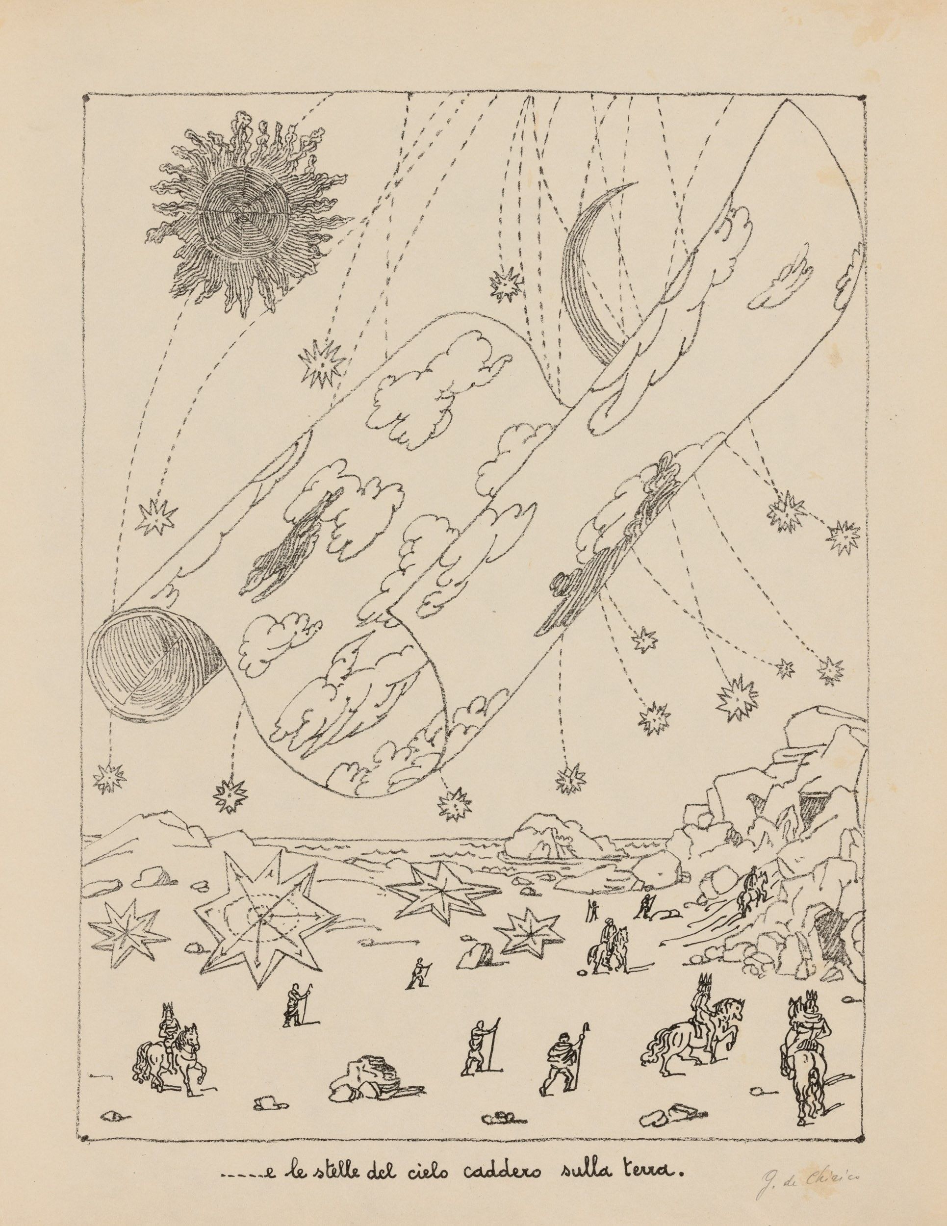 venti litografie tirate a mano nello studio di Piero Fornasetti, Largh. 27,4 - Alt. 35 Cm 1941 ciascuna litografia è firmata in basso a destra Edizioni Della Chimera, Milano 1. Io sono l'Alfa e l'Omega 2. Qualcuno, simile ad un figliolo d'uomo 3. Ed ecco un trono stava nel cielo 4. E gli fu data una corona 5. Il suo nome e' Morte e L'Orco lo accompagnava 6. E gli fu data una grande spada 7. Aveva una bilancia nella sua mano 8. E le stelle caddero sulla Terra 9. Sette Angeli provvisti di sette pieghe 10. E mi disse: prendi a divoralo! 11. E ci fu una grand guerra nel cielo 12. Una donna ravvolta nel sole 13. Ed ecco un gran drago 14. E vidi una bestia salire dal mare 15. Gridando a gran voce a colui che e' seduto sulla nuvola 16. Dopo questo, vidi una grande folla 17. Ed ecco un cavallo bianco 18. La nuova Gerusalemme discende dal cielo 19. Un fiume d'acqua viva 20. Caddi per adorare ai piedi dell'angelo