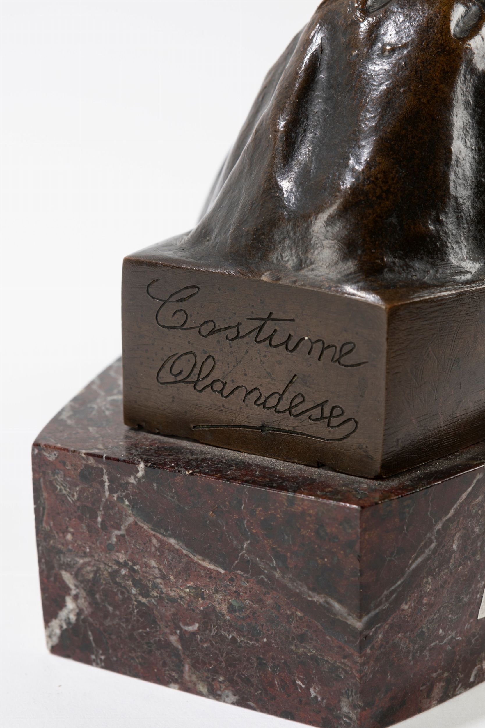 scultura in bronzo su base in marmo, cm 28 x 24 x 12 (base inclusa) 1907 firmata e datata sul lato: C. Betta / 1907; titolata in basso al centro: EDELVEIS; iscrizione sul lato: Costume / olandese; e altra iscrizione al retro: RIPRODUZIONE VIETATA / PROPRIETA' ARTISTICA / CORRADO BETTA - TORINO