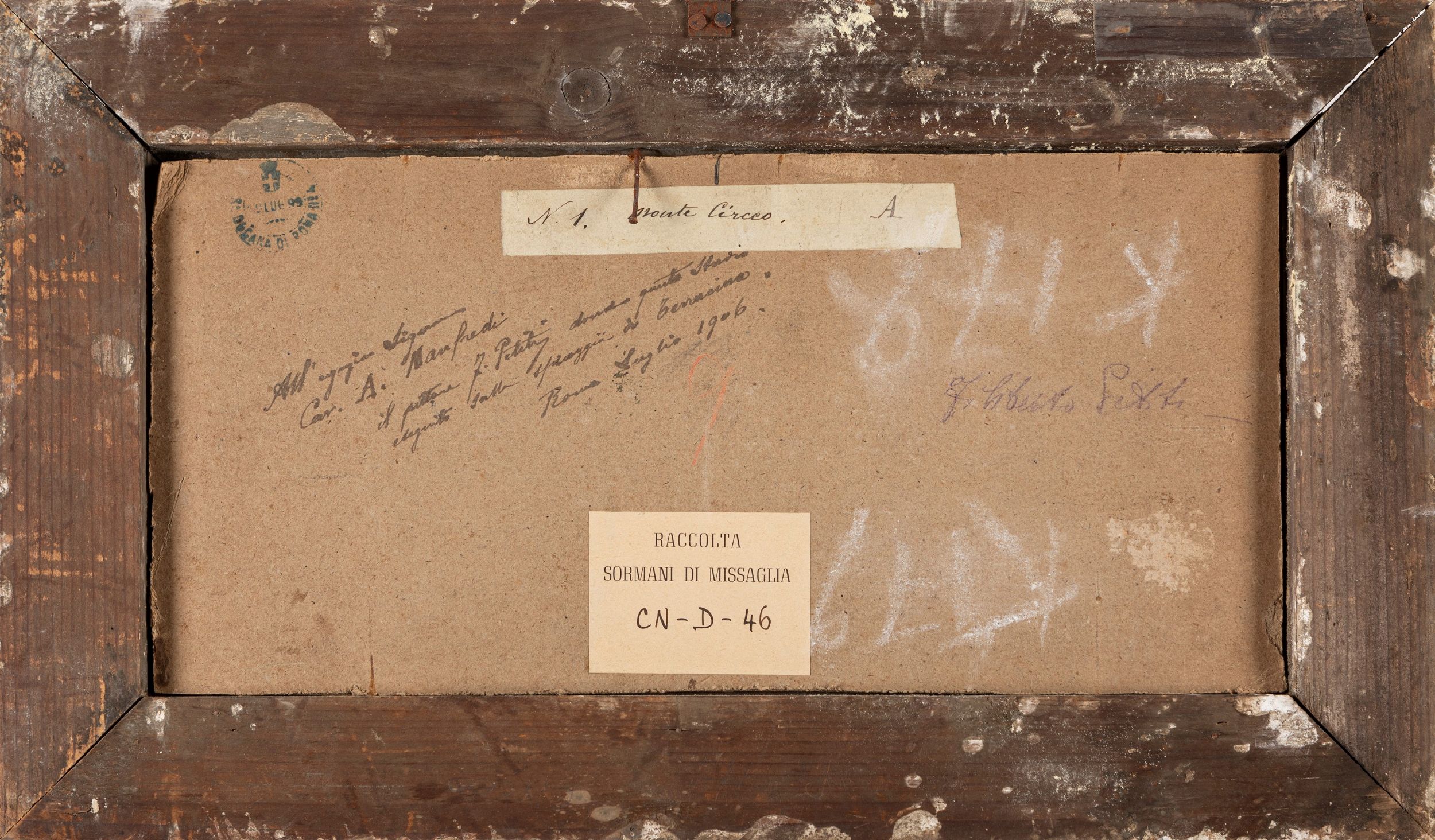 firmato in basso a destra: Petitial retro, sul cartone, firmato, dedicato e datato 1906; etichetta del pittore con il titolo ed etichetta relativa alla provenienza (Sormani di Missaglia)