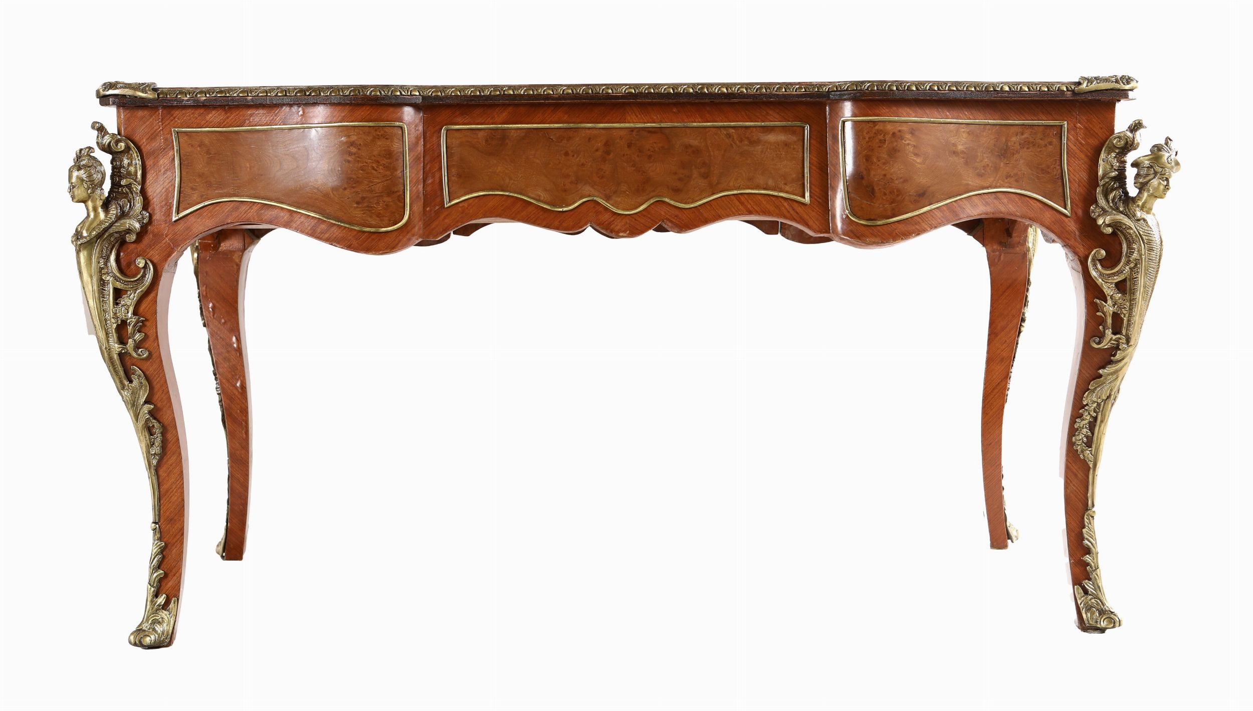 piano rivestito in pelle, fascia sagomata suddivisa in tre cassetti allineati privi di traverse, gambe mosse calzate da scarpette, abbellite all'attaccatura da espagnolettes in bronzo in forma di erme femminili e maschili