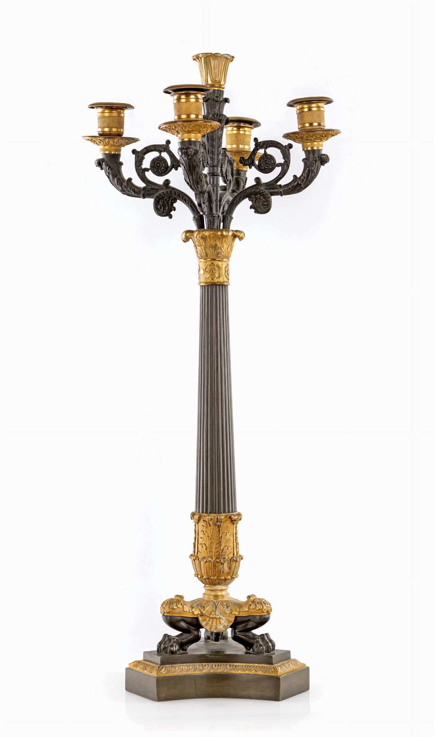 Coppia di candelabri in bronzo brunito e dorato a cinque luci, XIX secolo