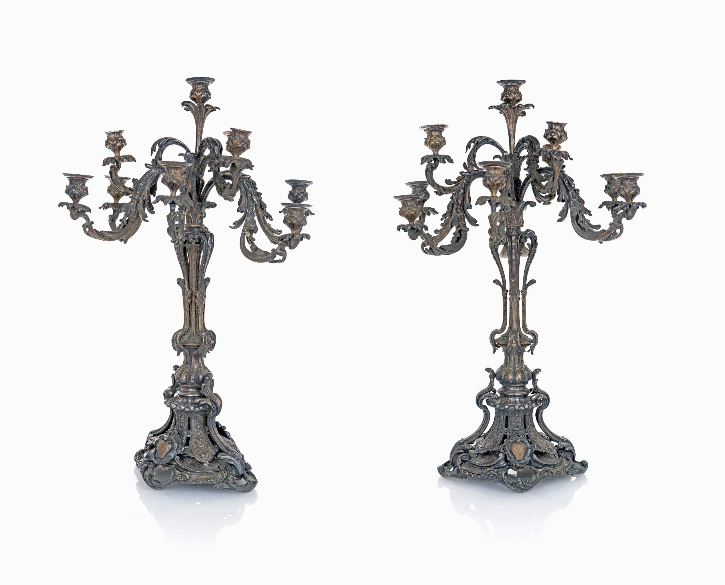 Coppia di grandi candelabri in metallo argentato a otto luci, XIX secolo