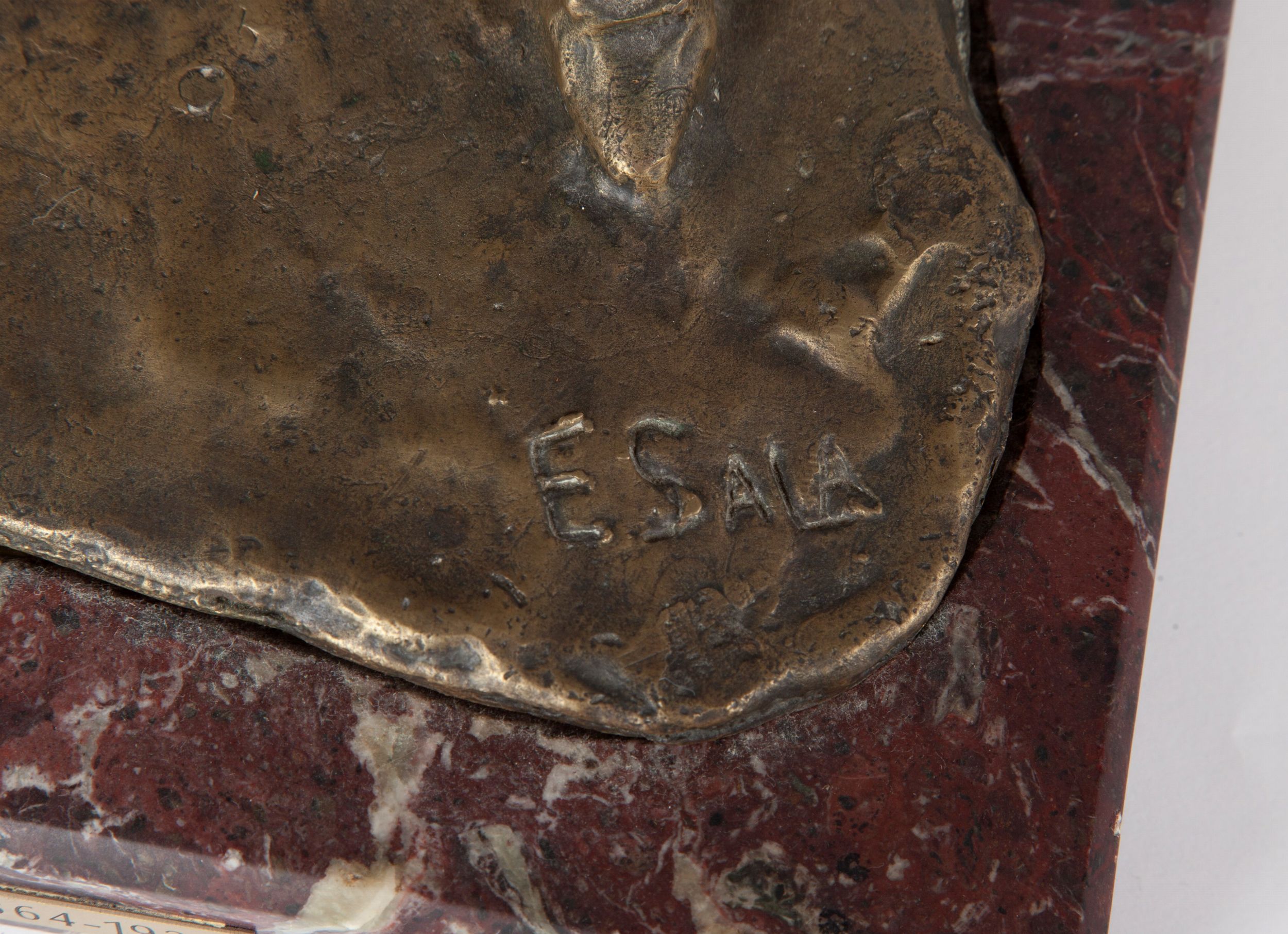Scultura raffigurante un uomo con cappello e chiave in mano, ritratto stante con andatura incerta. Firmato E. Sala