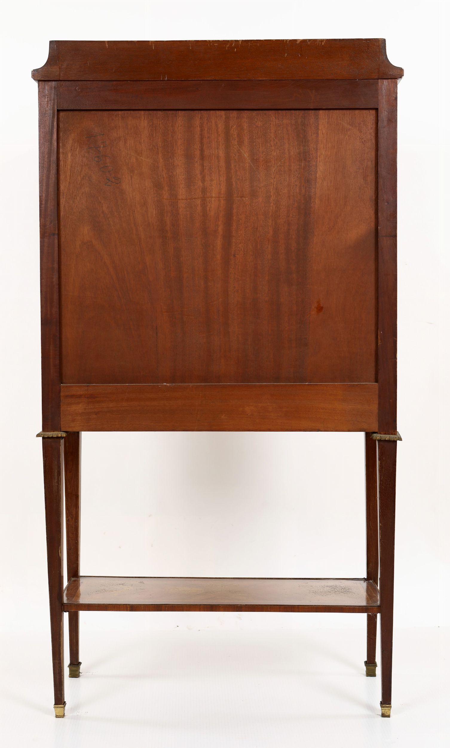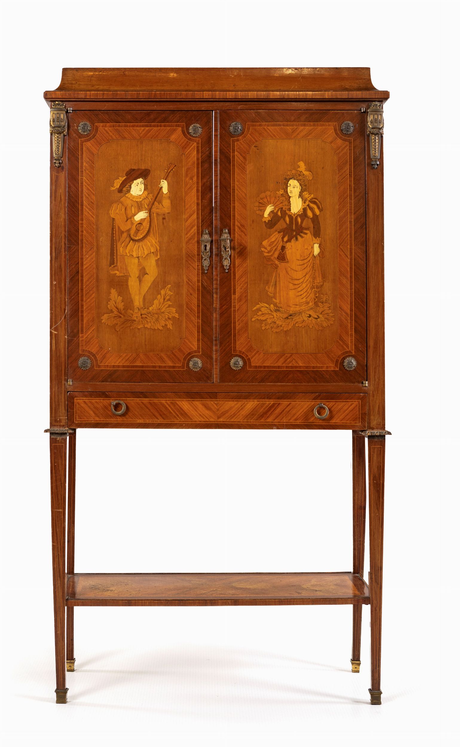caratterizzato da figure di musico e di dama in abiti rinascimentali poste come ornamento delle ante frontali; gambe rastremate unite da un piano