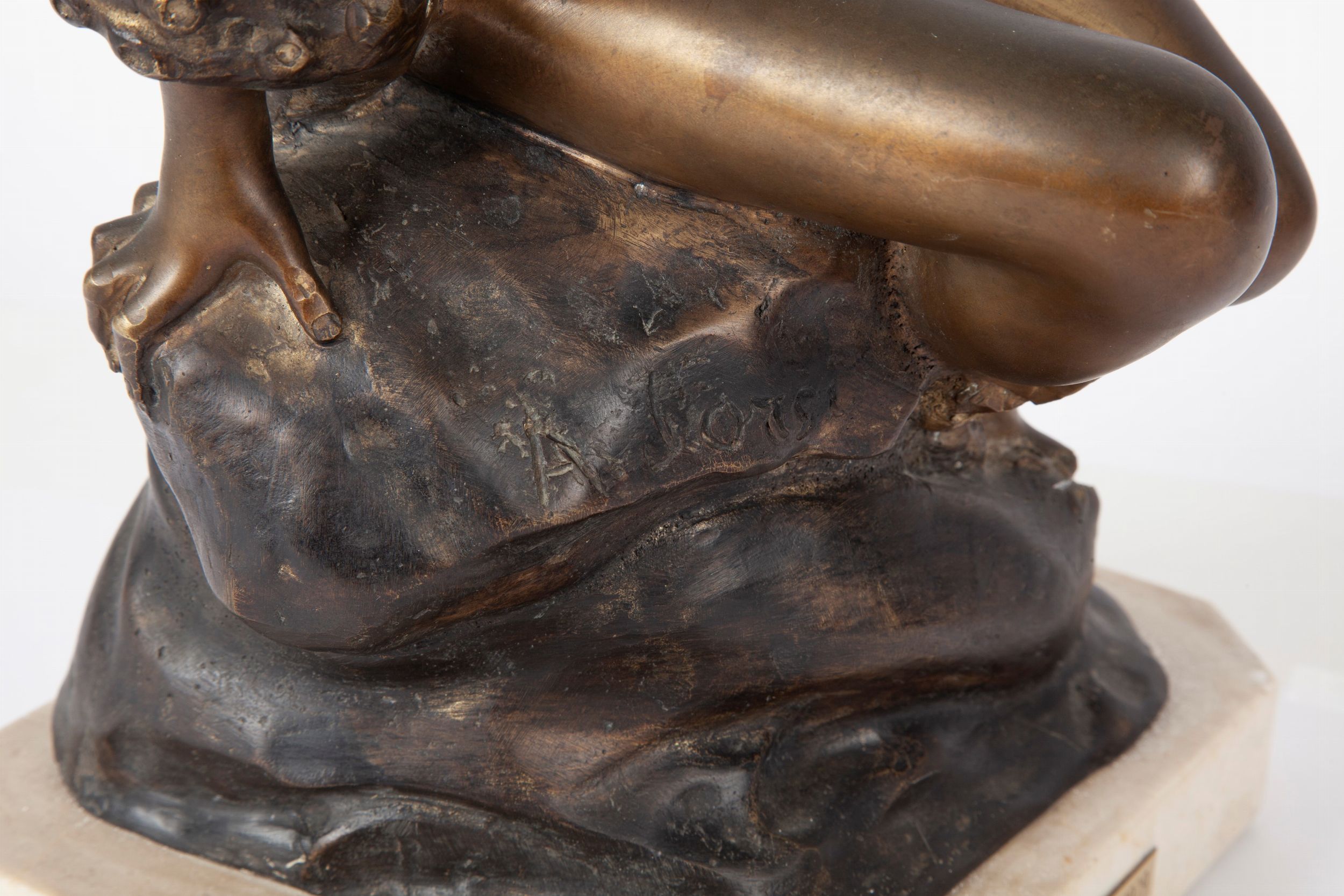 Scultura raffigurante una giovane donna adagiata su uno scoglio mentre tenta di allontanare un polpo. Firmata sullo scoglio: A. d'Orsi