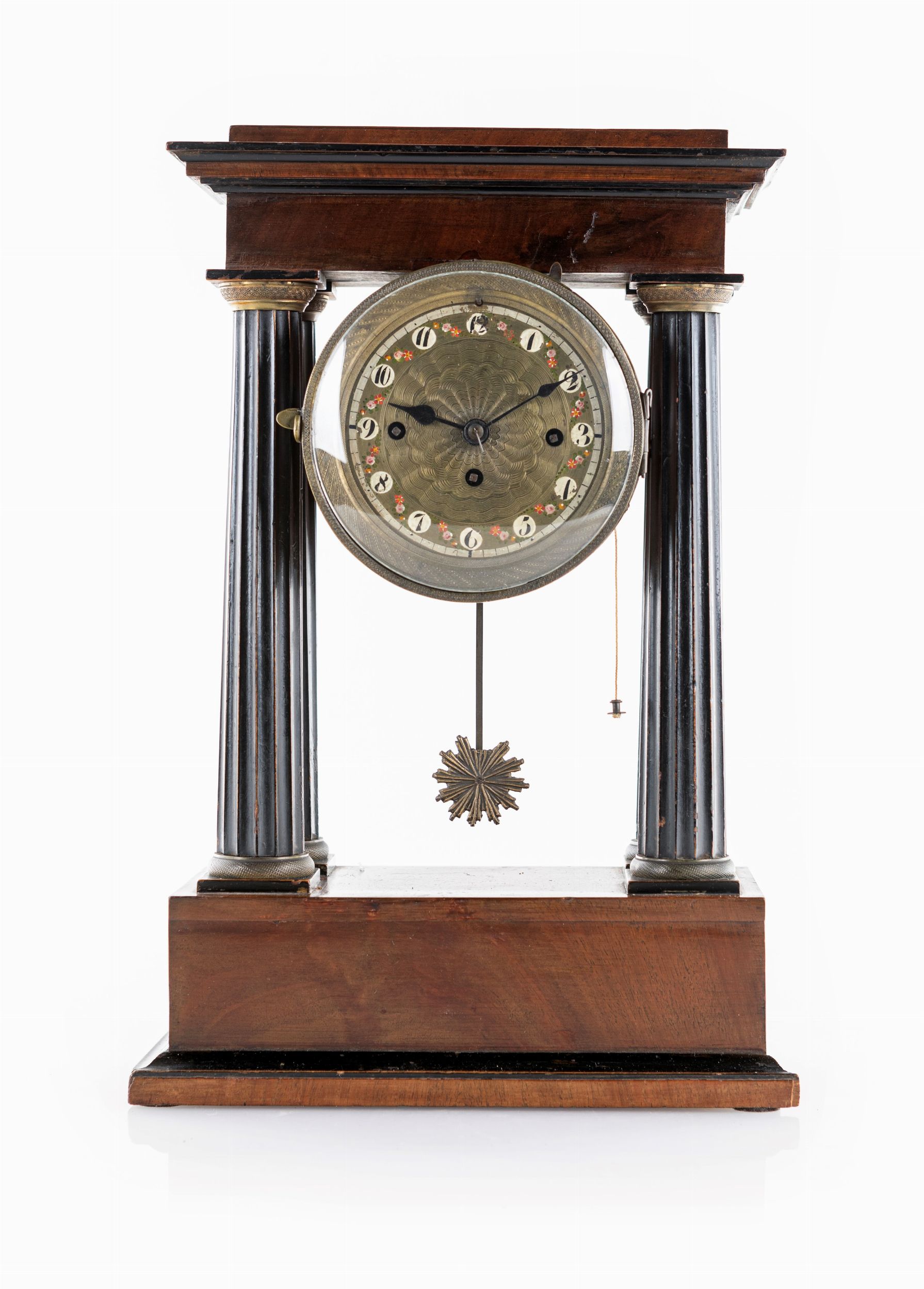 cm 39x26x13 orologio con quadrante circolare in bronzo dorato a tre fori di carica e indicazione oraria a numeri arabi dipinti su placchette bianche incorniciate da piccole composizioni di fiori, sorretto da colonne scanalate in legno ebanizzato. Meccanismo a carica giornaliera, scappamento ad ancora, sospensione a filo. Suoneria a ore e quarti al passaggio su gong.