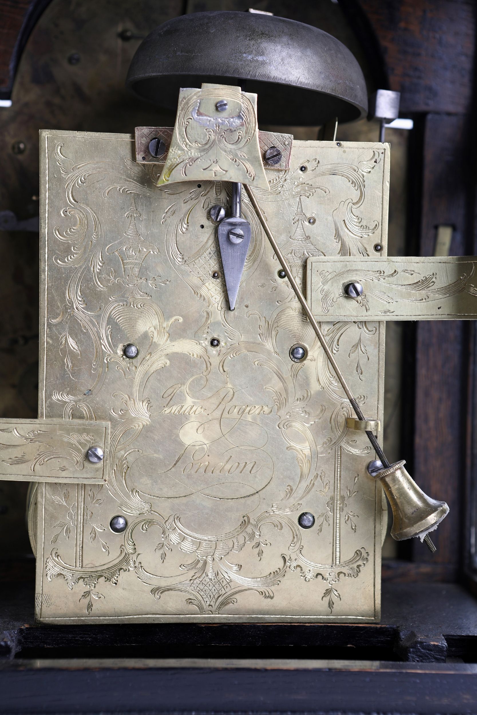 cm 50x27x17,5 quadrante dorato con fascia oraria argentata ed incisa a numeri romani; lancette in ferro traforate, decori applicati in bronzo dorato, apertura per il falso pendolino e finestrella per l'indicazione del giorno del mese; quadrantino per l'esclusione della suoneria. Meccanica a otto giorni, scappamento a verga, plance posteriore incisa a motivi di foglie d'acanto, firmata Isaac Rogers London; suoneria a ore e mezze al passaggio su campana