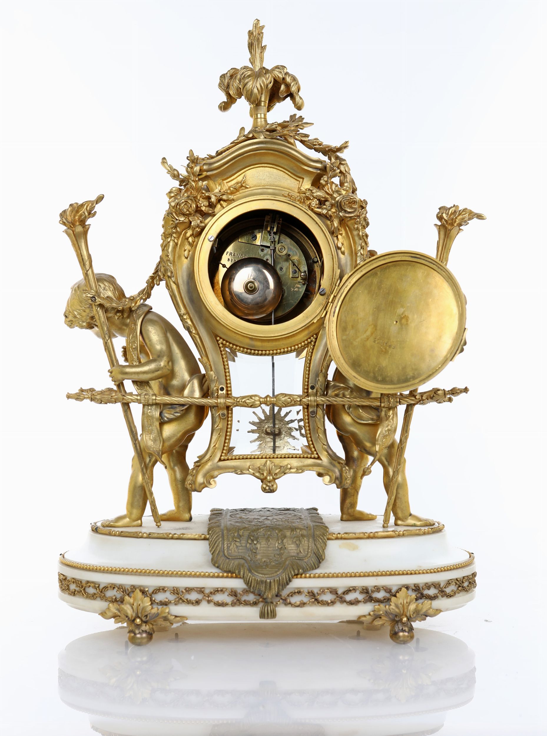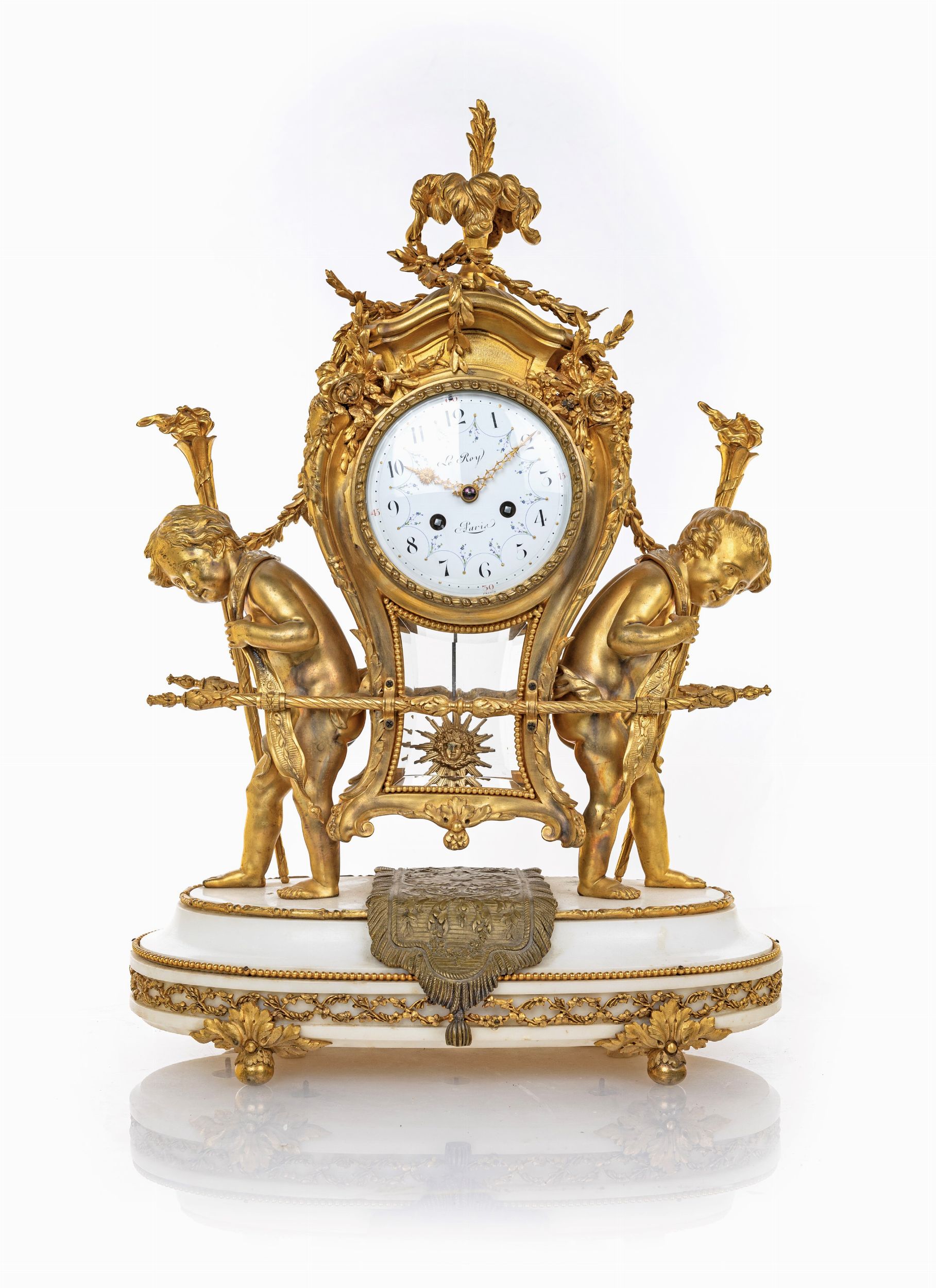 cm 60x42x24 Cassa sagomata sospesa, arricchita da rilievi fioriti e vegetali, idealmente sorretta da figure di amorino stanti su base ovale in marmo bianco guarnita da applicazioni in bronzo dorato. Meccanica a scappamento ad ancora e sospensione a lamella, suoneria a ore e mezze al passaggio su campanello. Quadrante in smalto bianco a due fori di carica, con indicazione oraria a numeri arabi circondati da delicate ghirlande fiorite dipinte in policromia, firmato Le Roy à Paris.