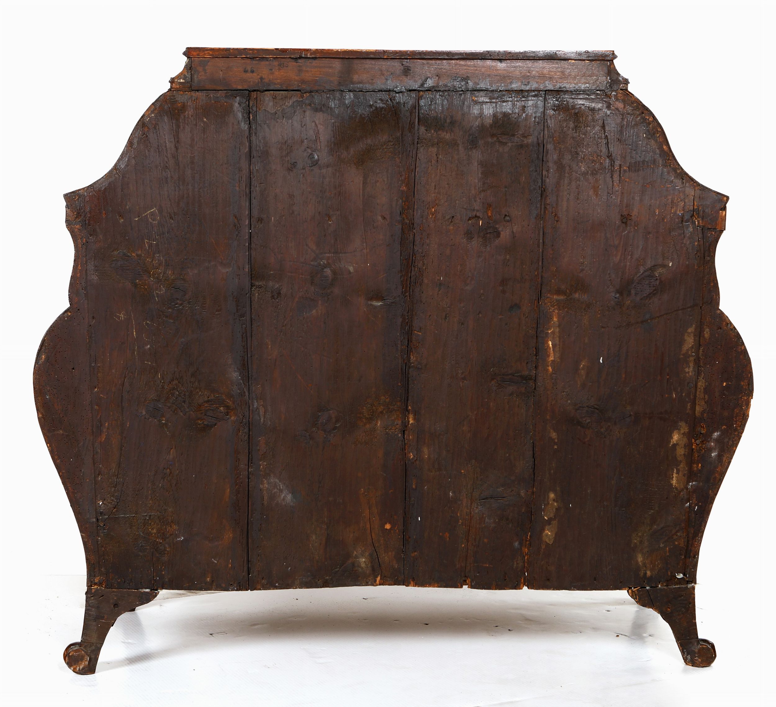 cm 113x130x60 corpo dalla caratteristica forma bombata, impreziosito da riserve sagomate definite da filettature intarsiate; la ribalta ospita quattro tiretti, fascia concava comprendente un cassetto, facciata suddivisa in due cassetti privi di traversa con maniglie in bronzo; spigoli curvilinei così come il grembiale sottolineato da orlo modanato; piedi sfuggenti terminanti a ricciolo. Difetti e rifacimenti. Difetti e restauri