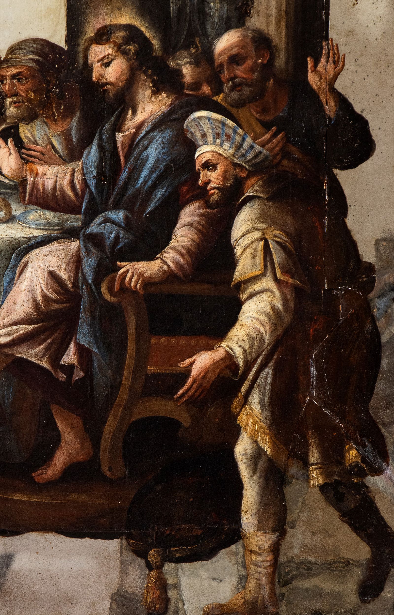 Questa stupefacente coppia inedita di dipinti su specchio rappresenta un unicum di irresistibile fascino nella pittura napoletana del Seicento. Per evidenze stilistiche piuttosto flagranti è possibile riferire le due pitture alla mano di Luca Giordano, massimo artista barocco napoletano. Indirizzano direttamente a lui l'impaginazione delle due scene sacre, entrambe imperniate su affollati banchetti che hanno Gesù per protagonista, come pure la galleria dei personaggi allineati in sequenza orizzontale come in un fregio, in cui si ritrovano tante fisionomie ricorrenti nella sua pittura. Anche l'acceso colorismo di marca neo-veneta e la composizione di spiccato gusto veronesiano ci riportano ai modi peculiari di Luca Giordano tra la metà del sesto e la fine del settimo decennio del Seicento. Ma il più limpido indizio a supporto dell'attribuzione è il confronto tra la nostra Cena in casa del Fariseo e la tela dello stesso soggetto in tutto simile già presso la galleria Michael Simpson a Londra e oggi in collezione privata (vedi Ferrari - Scavizzi 2003, AO103, pp. 48 e 170). Oreste Ferrari aveva associato quest'ultima a una notazione di Francesco Saverio Baldinucci nella sua Vita di Luca Giordano, in cui si menzionava un'opera commissionata al pittore dal marchese di Astorga, ambasciatore di Spagna a Roma e poi Viceré a Napoli: le Nozze del Fariseo sul gusto di Paol Veronese. Seppur con varie piccole varianti la composizione risulta largamente e inequivocabilmente sovrapponibile a quella del nostro dipinto e occorre sottolineare che di tale composizione esistono due probabili disegni preparatori, uno appena abbozzato in collezione privata svizzera, l'altro, molto più dettagliato, in collezione privata italiana (Ferrari - Scavizzi 2003, DO37v e DO38r, pp. 106 e 218). Delle Nozze di Cana allo stato delle nostre conoscenze non sembrano esserci ulteriori redazioni di mano di Giordano, ma merita di essere qui ricordato un altro foglio autografo a penna, inchiostro e acquerello oggi al Fitzwilliam Museum di Cambridge che seppure sostanzialmente diverso mostra delle non trascurabili analogie di impianto compositivo.