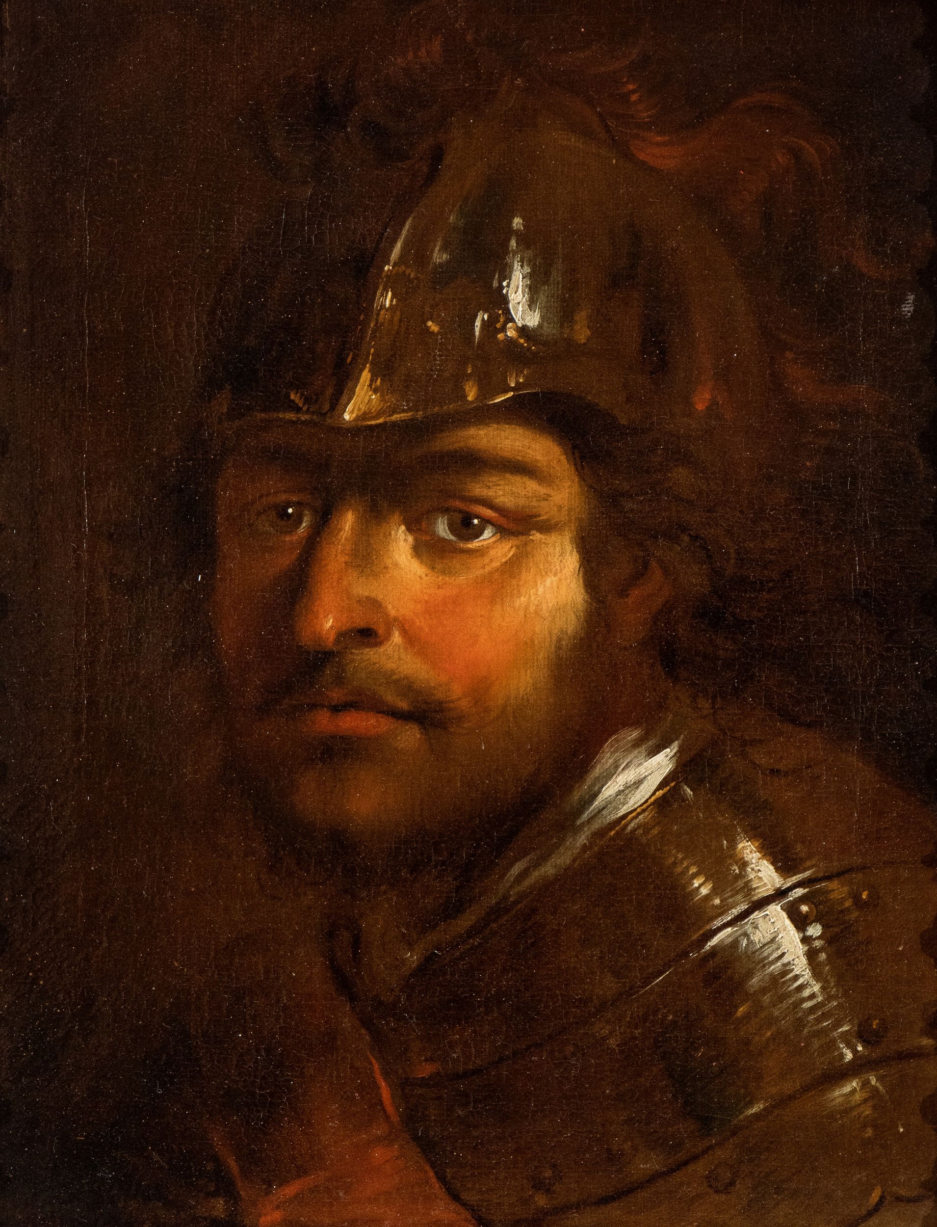 Soprattutto l’Autoritratto come uomo d’armi di profilo, Siena, collezione del Monte dei Paschi (Volpi 2014, cat. 86) mostra strette affinità con la nostra tela, in cui è rappresentato un soldato con elmo e corazza posto di tre quarti, che fissa il riguardante con uno sguardo intenso e profondo e un'espressione vaga e malinconica. La fisionomia richiama evidentemente quella di Salvator Rosa, come si evince dalla comparazione con gli Autoritratti succitati. La testa è leggermente girata al di sopra della spalla sinistra, in una postura che si ritrova nell'Autoritratto in veste di guerriero della collezione Chigi Saracini, in altri due Autoritratti oggi all'Institute of Art di Detroit e in collezione privata inglese (Volpi 2014, cat. nn. 146 e 147) e nel Diogene del Musèe Fesch di Ajaccio (Volpi 2014, cat. n. 145): tutte opere databili tra gli anni fiorentini e quelli romani del pittore (1645-1650).