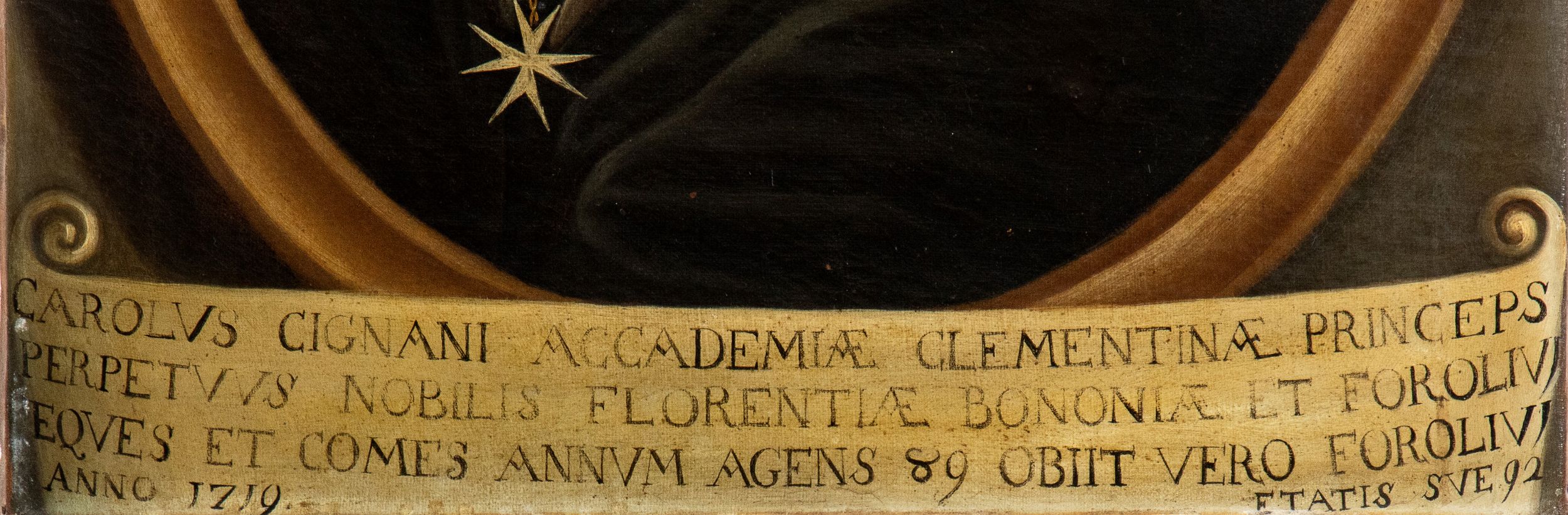 Il dipinto reca iscrizione entro cartiglio nel margine inferiore: CARLVS CIGNANI ACCADEMIAE CLEMENTINAE PRINCEPS / PERPETVVS NOBILIS FLORENTIAE BONOMIAE ET FOROLIVI / EQVES ET COMES ANNVM AGENS 89 OBIIT VERO FOROLIVI / ANNO 1719 / ETATIS SVE 92.