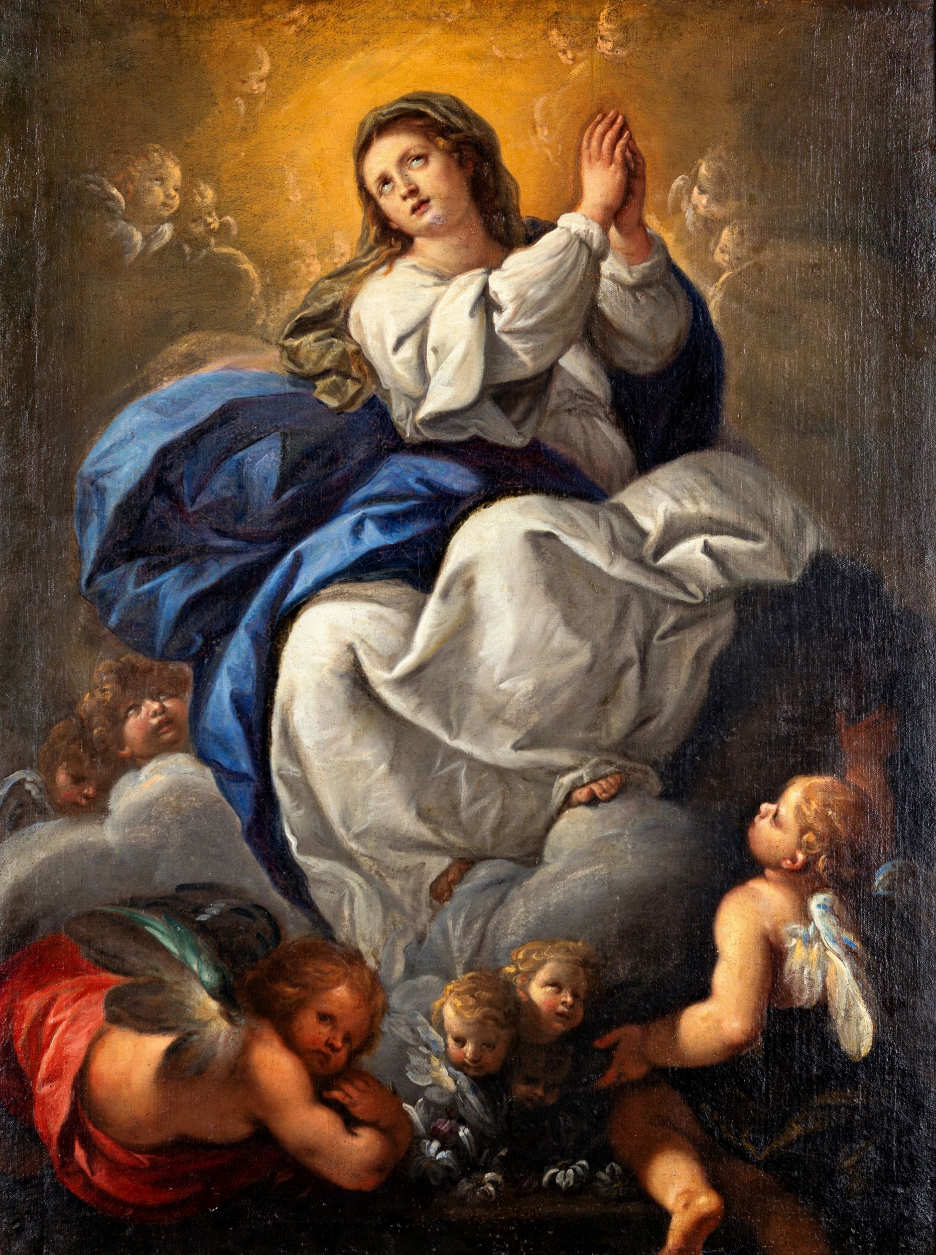 Dal cielo illuminato da una luce gialla emerge con grande forza la figura della Madonna, vestita riccamente con una veste blu e bianca, assisa sul un trono di nubi, contornata da putti. Le pennellate morbide ma decise, unito a sfumature cromatiche che delineano le figure, avvicinano la tela alla migliore produzione pittore di Carlo Francesco Nuvolone, grande interprete del barocco milanese.
