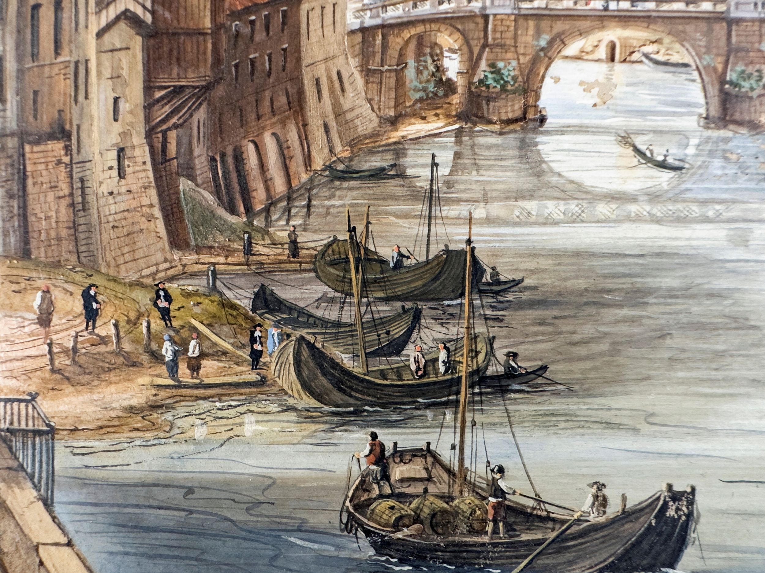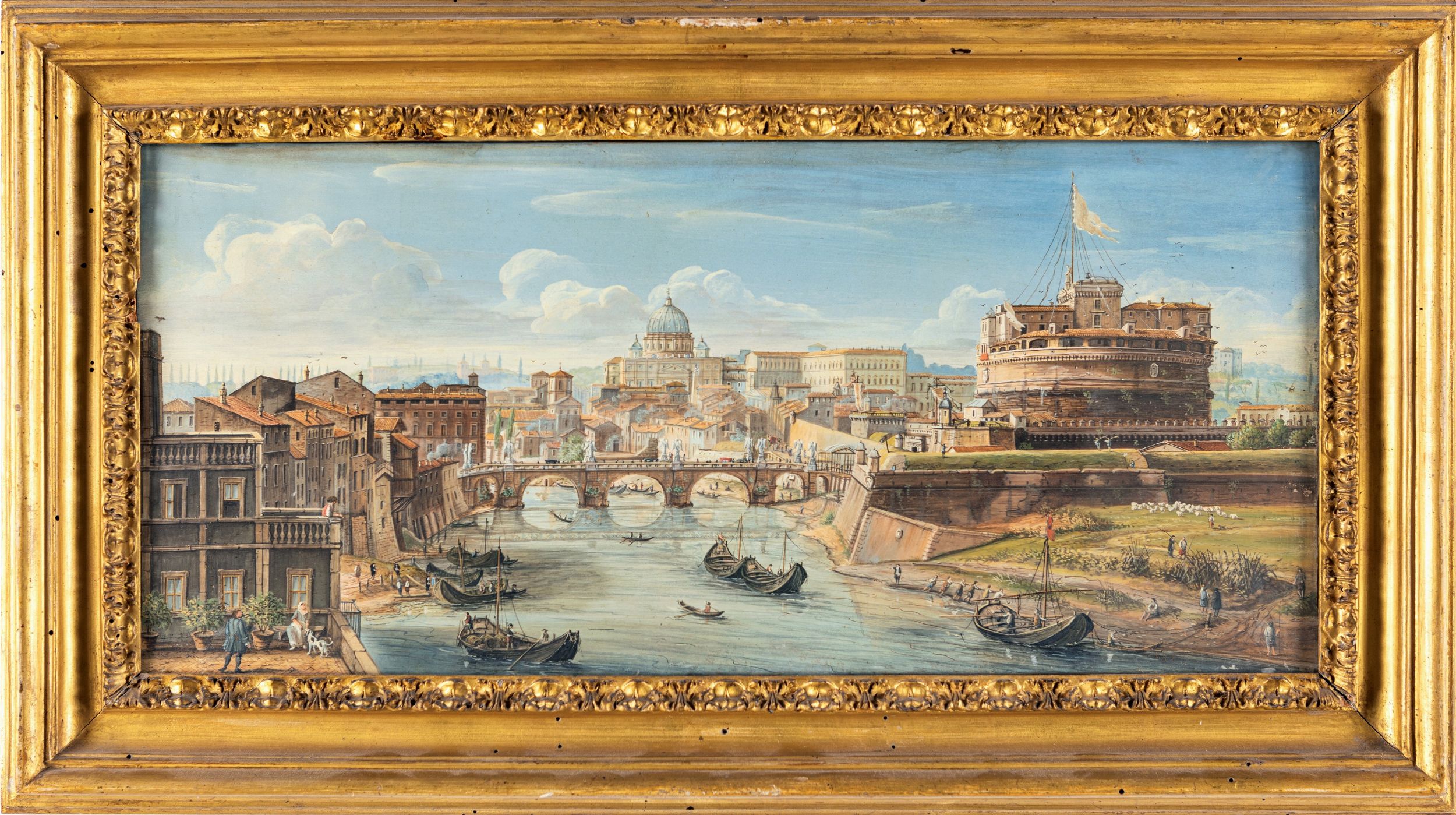 Coppia di tempere su pergamena Veduta di Castel Sant'Angelo e del Porto di Ripet [..]