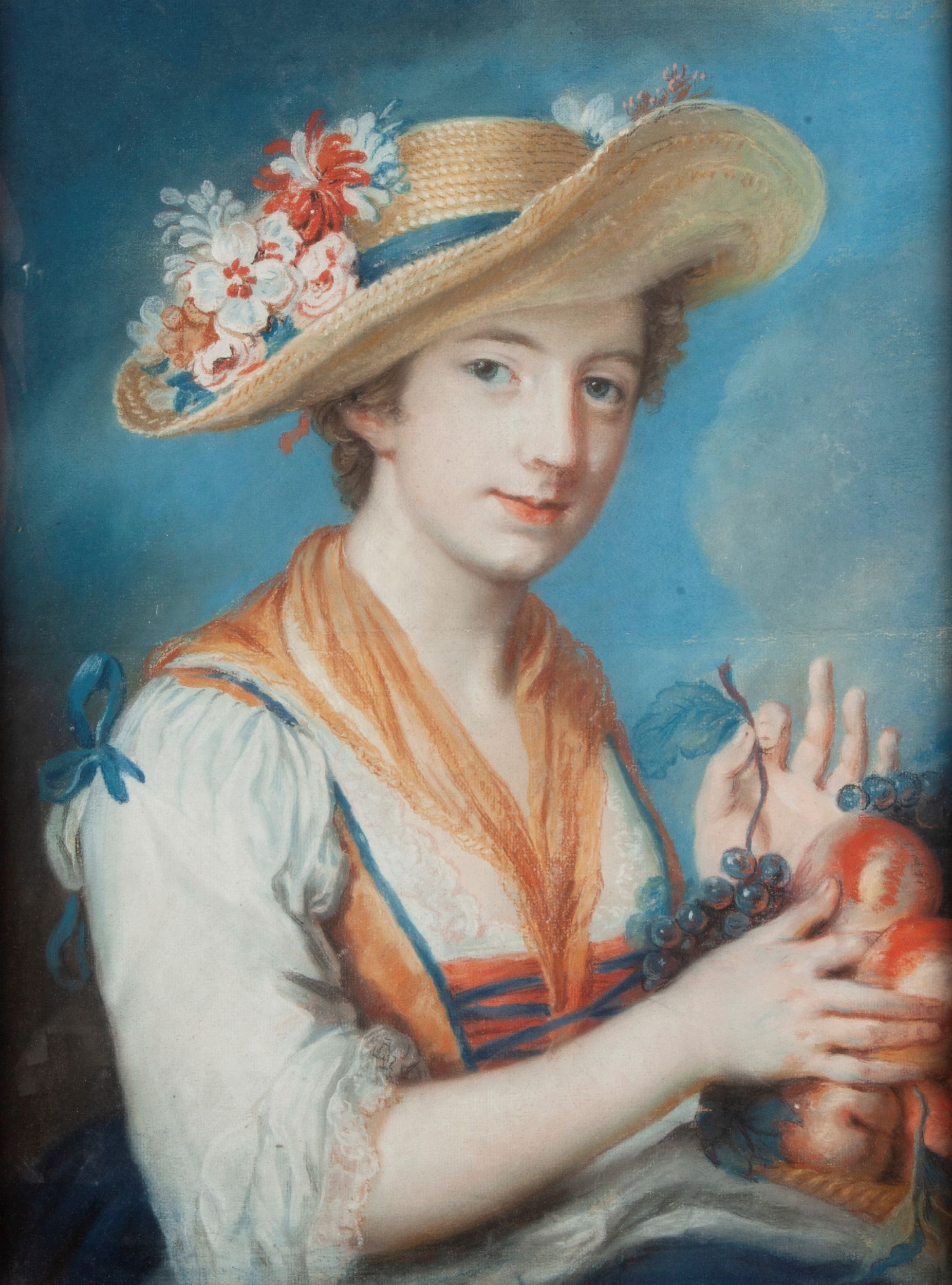 Cornice coeva. Su un cielo terso si staglia la figura di una giovane nobildonna, abbigliata come una pastorella con in testa un cappello di paglia adornato da fiori primaverili e nelle mani delle pesche e acini d’uva. Il medium utilizzato, il pastello, donano ai dettagli della veste, come il foulard sul collo e i pizzi delle maniche, un’estrema leggerezza. Il pittore d’origine francese e vicino ai modi Jeanne-Etienne Liotard, ha indubbiamente visto i pastelli di Rosalba Carriera, che circolavano in tutta Europa.