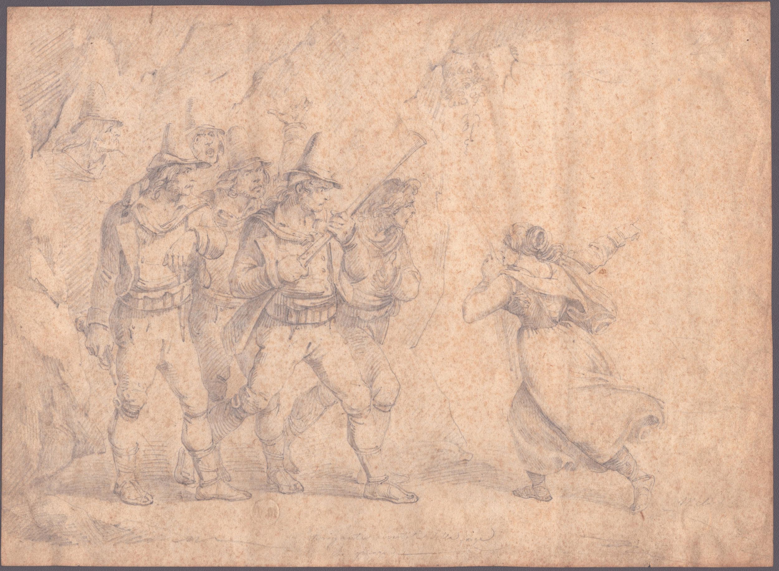 Il disegno raca timbro a secco di collezione non identificato (P. M. entro un cerchio) e una didascalia a matita al centro del margine inferiore: BRIGANTI AVVERTITI DELLA FORZA CHE GIUNGE.