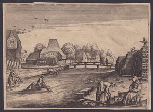 Paesaggio con casolare lungo il fiume - Paesaggio con casolare e contadini