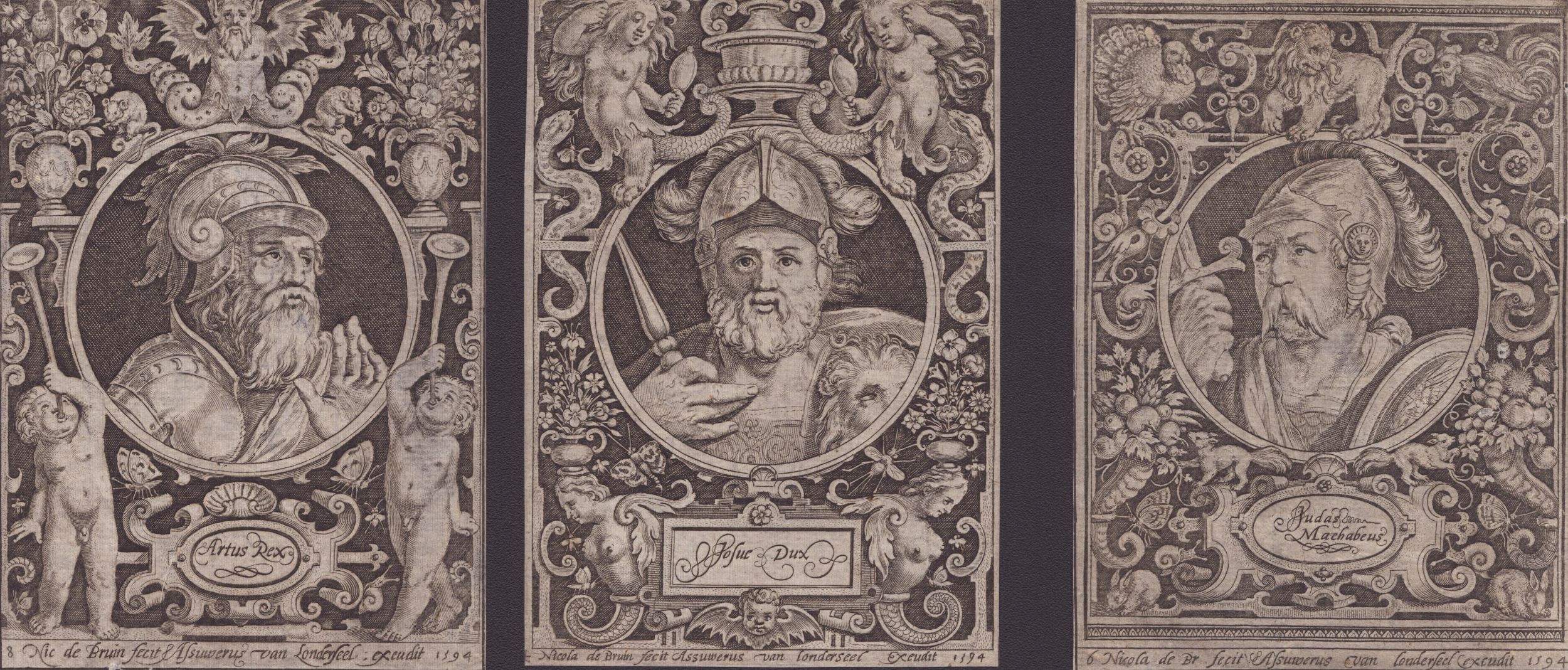 1594 lotto di 3 incisioni dalla serie di 12 raffiguranti le teste dei regnanti in bordi ornamentali. Bulino, 124 x 92 mm ca. New Hollstein 266, 268, 270. I stato, pubblicato da Assuerus van Londerseel. Belle impressioni su carta vergata sottile (una con filigrana). Esemplari rifilati. In buono stato salvo qualche assottigliamento.