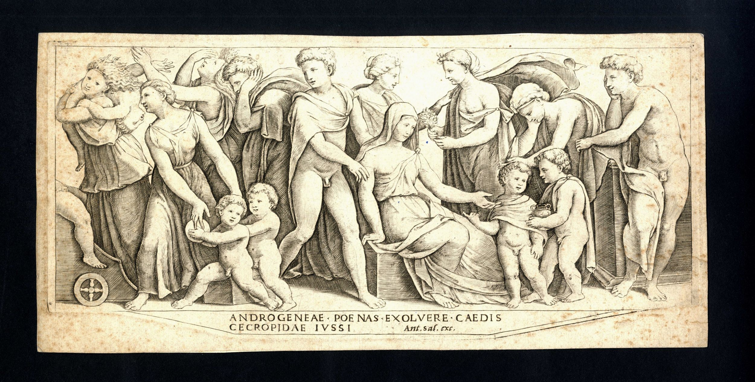 Bulino, 326 x 157 mm. Bartsch XV.28.Esemplare in stato tardo, stampato su carta pesante vergata. Foglio rifilato con margini lastra conservati, tracce di foxing agli angoli.
