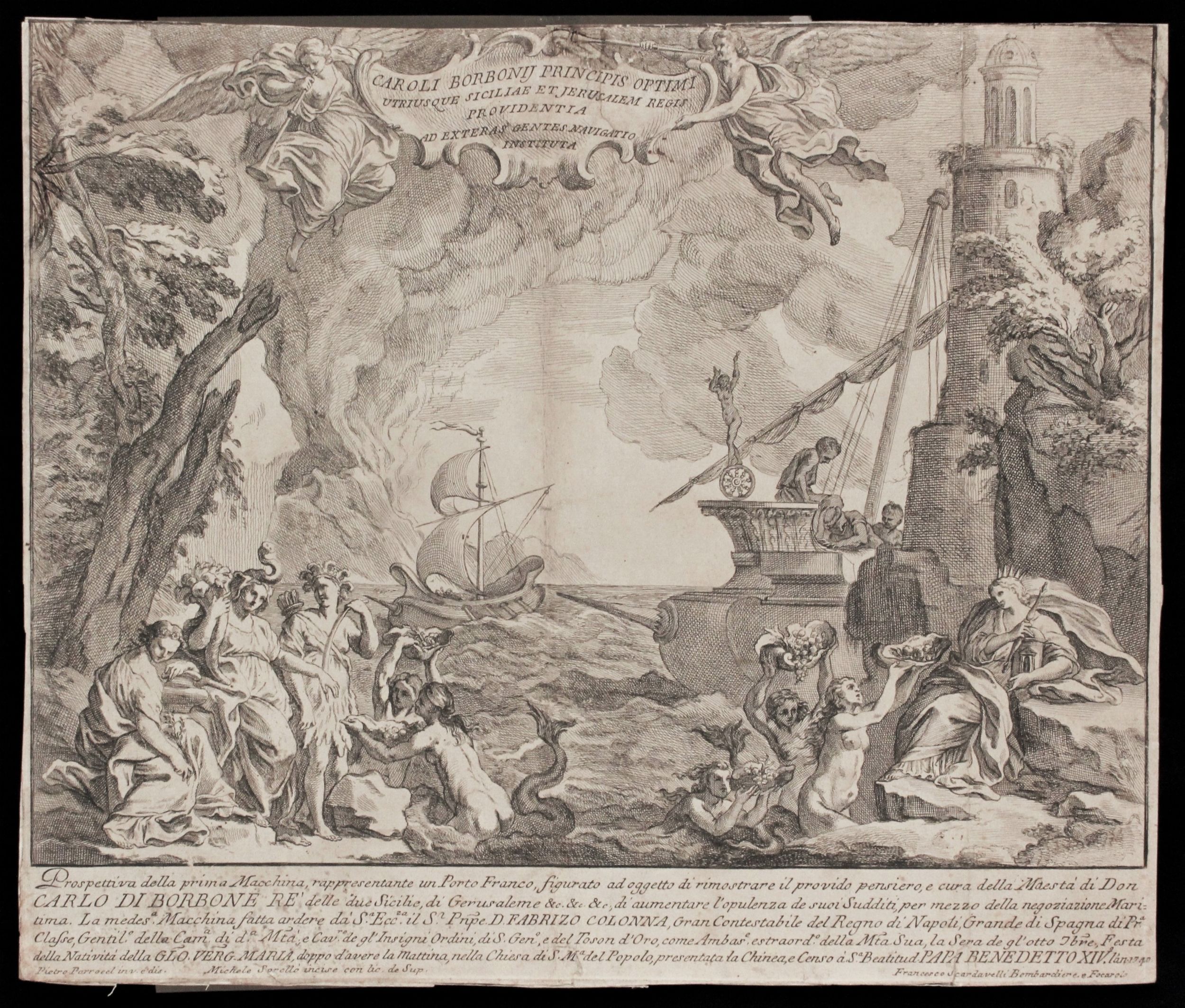 dal disegno di Pierre Parrocel. Acquaforte, 440 x 375 mm. Esemplare stampato su carta spessa, con foglio rifilato al margine lastra.